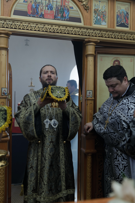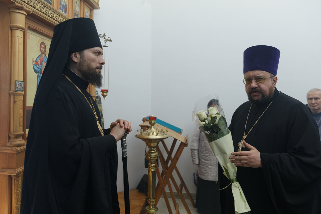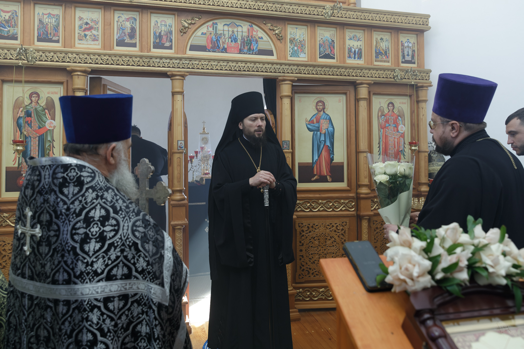 Затем с приветственным словом к Архипастырю обратился настоятель храма иерей Дионисий Киреев. Священнослужитель поблагодарил епископа Дионисия за духовную радость совместного молитвенного общения в эти святые дни и подчеркнул, что совершение Литургии Преждеосвященных Даров стало историческим событием – впервые за всю историю храма. Затем иерей Дионисий преподнес Владыке букет цветов.
