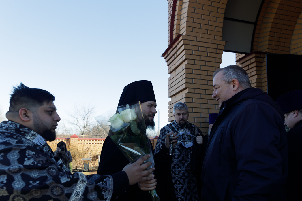 У храма Правящего Архиерея встречали: благочинный Калачеевского церковного округа иерей Иоанн Суздальцев и глава администрации Петропавловского муниципального района Владимир Григорьевич Лаптиев.