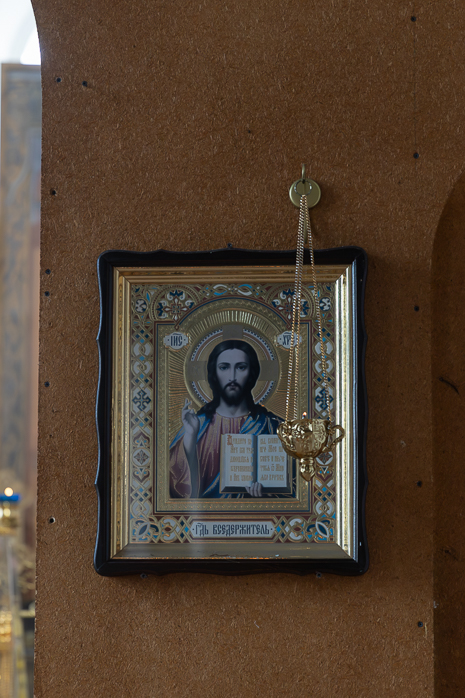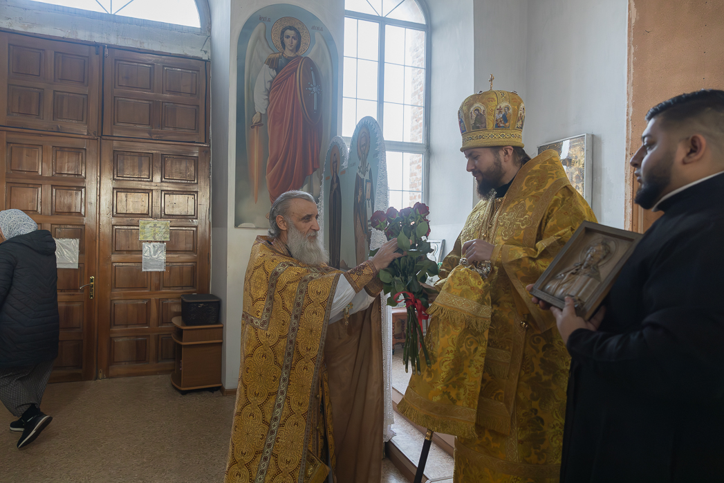 Далее со словом приветствия к епископу Дионисию обратился настоятель храма Преображения Господня с. Заброды протоиерей Евгений Сорокин. В честь престольного праздника и в знак сыновней любви священнослужитель преподнес в дар Архипастырю деревянную резную икону Спасителя и букет цветов.