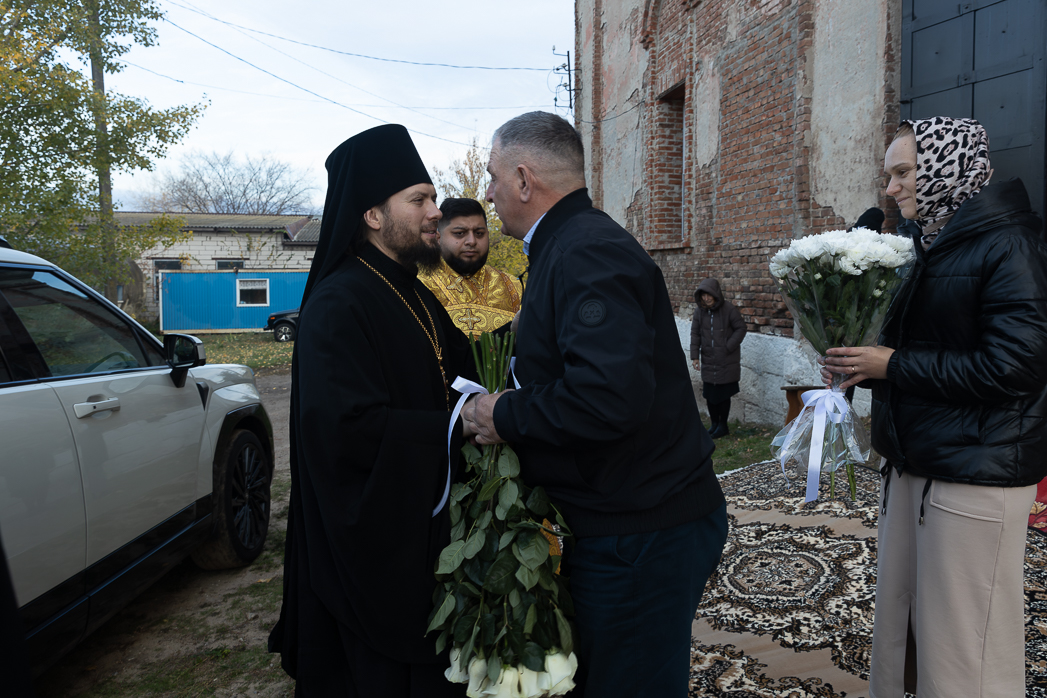 У храма Правящего Архиерея встречали: благочинный Калачеевского церковного округа протоиерей Евгений Бей; глава администрации Калачеевского муниципального района Николай Тимофеевич Котолевский, а также прихожане храма.