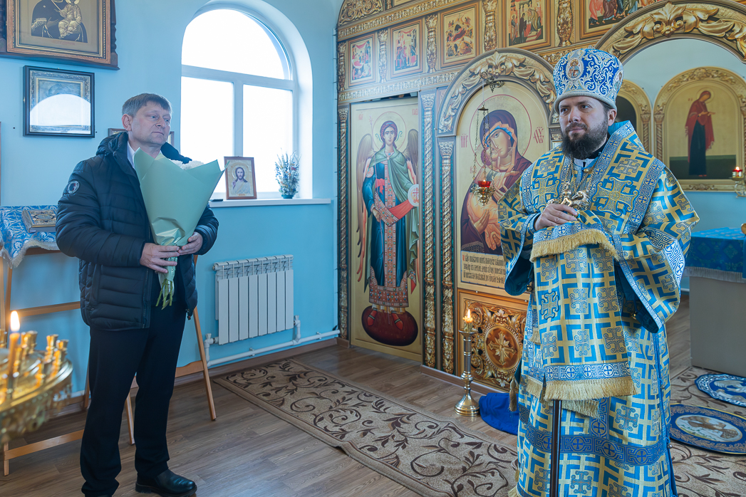 Затем с приветственным словом к епископу Дионисию обратился директор крестьянско-фермерского хозяйства поселка Ольховатка Сергей Евгеньевич Скипа. Он поблагодарил Владыку за визит и в честь престольного праздника преподнес в дар Архипастырю букет цветов.
