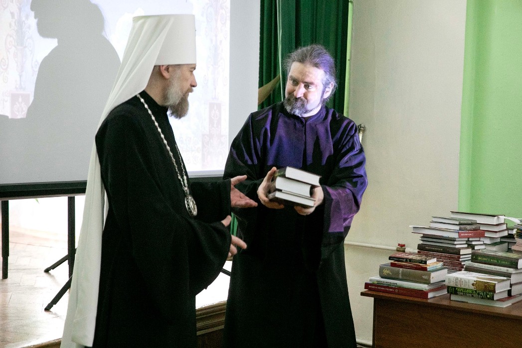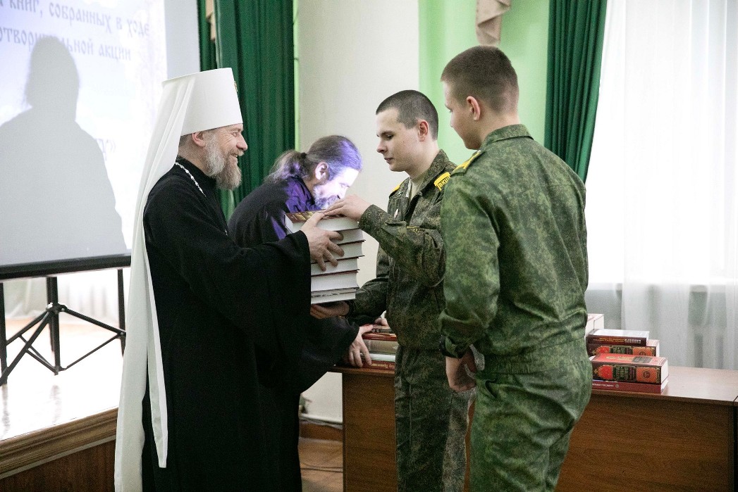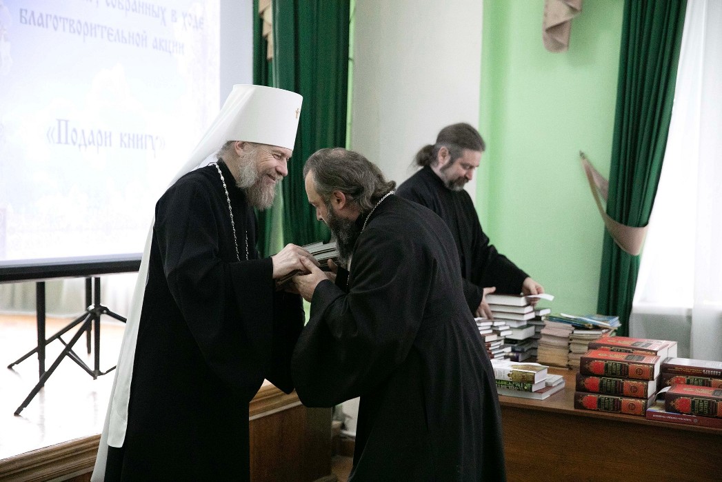 Завершился праздничный вечер традиционным вручением книг, собранных в ходе благотворительной акции «Подари книгу». Митрополит Леонтий передал комплекты православных изданий представителям государственных, социальных, образовательных, просветительских и пенитенциарных учреждений, а также воинским частям и в зону проведения специальной военной операции.