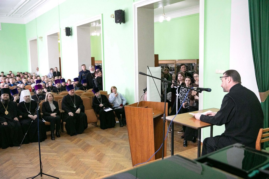 В актовом зале, расположенном на 4 этаже библиотеки, собрались священнослужители Воронежской митрополии, преподаватели и воспитанники Воронежской духовной семинарии, курсанты Военно-воздушной академии им. Н.Е. Жуковского и Ю.А. Гагарина, учащиеся православной гимназии во имя святителя Митрофана Воронежского, представители общественности, жители и гости столицы Черноземья.