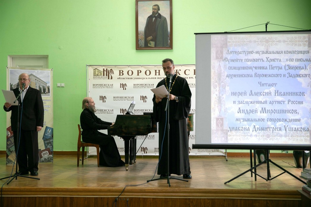 Творческая часть мероприятия продолжилась литературно-музыкальной композицией «Сумейте полюбить Христа…» по письмам священномученика Петра (Зверева), архиепископа Воронежского и Задонского, к 100-летию со дня его вступления на Воронежскую кафедру. Текст проникновенно читали иерей Алексий Иванников и заслуженный артист России Андрей Мирошников при музыкальном сопровождении диакона Димитрия Ушакова.