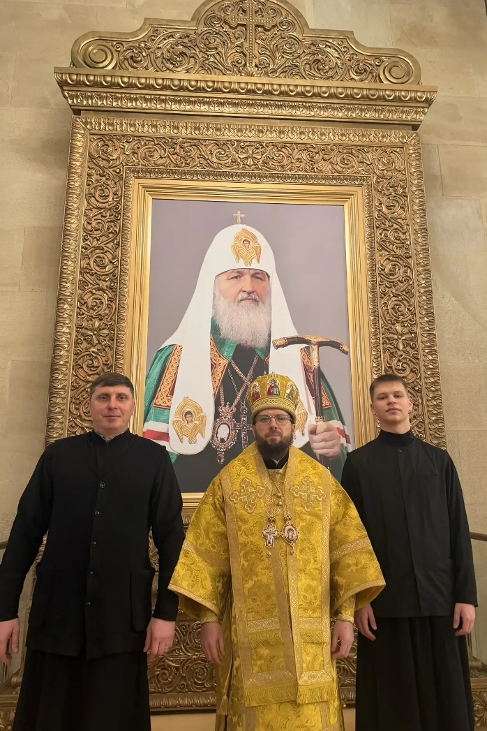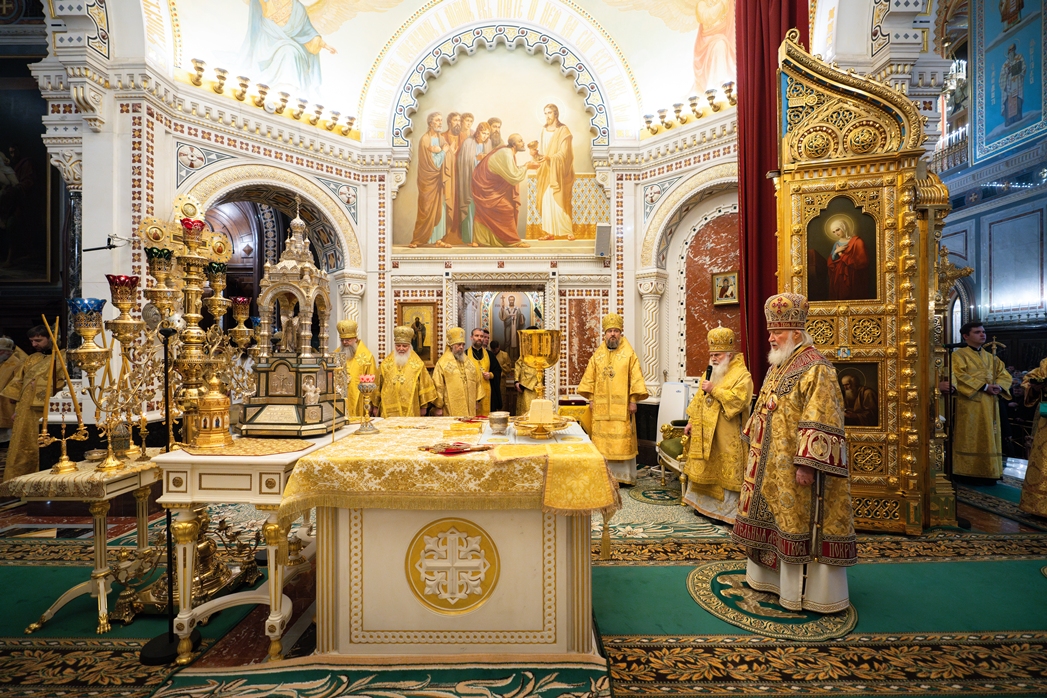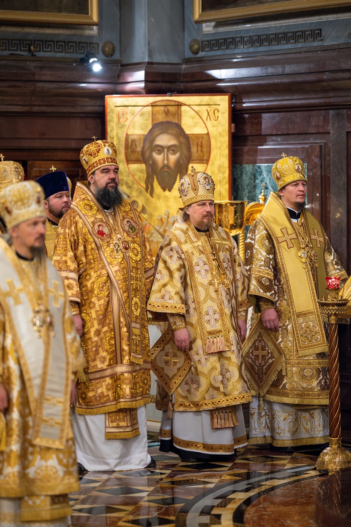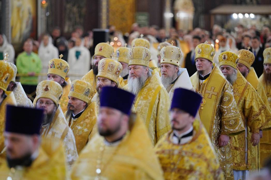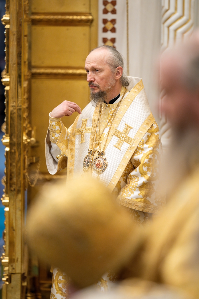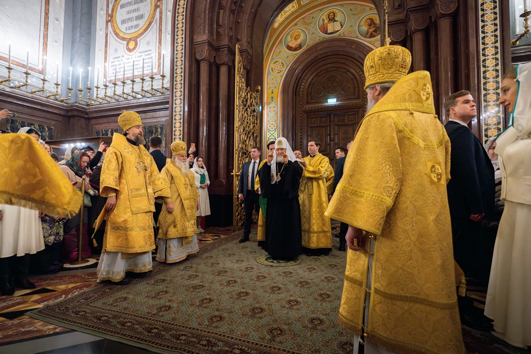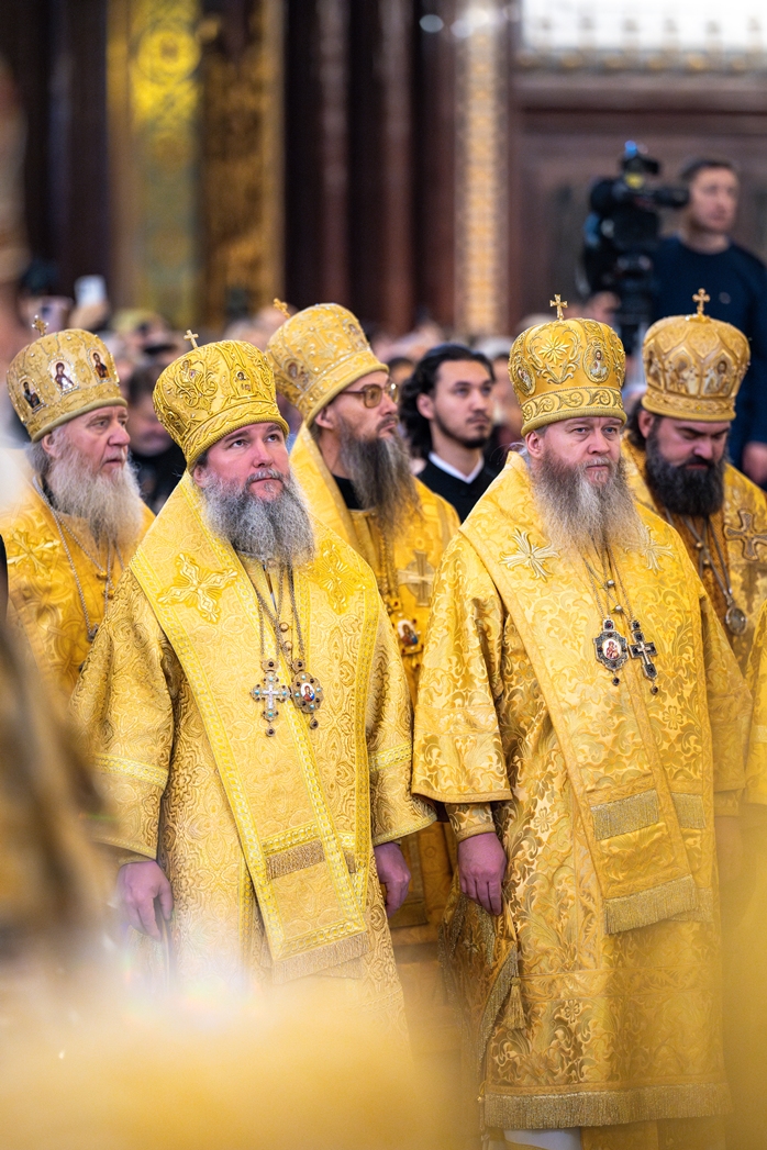 За Литургией Его Святейшеству сослужили: митрополит Ташкентский и Узбекистанский Викентий, глава Среднеазиатского митрополичьего округа; митрополит Минский и Заславский Вениамин, Патриарший экзарх всея Беларуси; митрополит Воскресенский Григорий, управляющий делами Московской Патриархии, первый викарий Патриарха Московского и всея Руси по г. Москве; митрополит Владимирский и Суздальский Никандр, председатель Финансово-хозяйственного управления Московского Патриархата; митрополит Тульский и Ефремовский Алексий; митрополит Липецкий и Задонский Арсений; митрополит Екатеринбургский и Верхотурский Евгений, председатель Синодального отдела религиозного образования и катехизации, председатель Оргкомитета Международных Рождественских образовательных чтений; митрополит Ростовский и Новочеркасский Меркурий; митрополит Луганский и Алчевский Пантелеимон; митрополит Саранский и Мордовский Зиновий; митрополит Архангельский и Холмогорский Корнилий; митрополит Смоленский и Дорогобужский Исидор; митрополит Читинский и Петровск-Забайкальский Димитрий; митрополит Хабаровский и Приамурский Артемий; митрополит Донецкий и Мариупольский Владимир; митрополит Самарский и Новокуйбышевский Феодосий; епископ Россошанский и Острогожский Дионисий, а также сонм архиереев Русской Православной Церкви, прибывших на Международные Рождественские чтения.