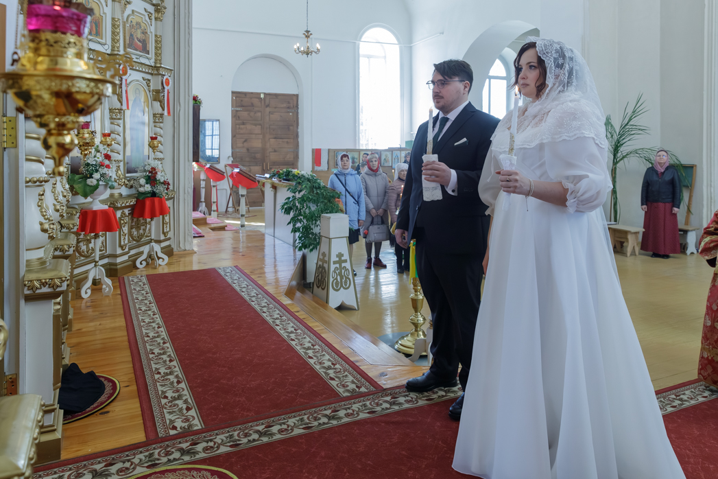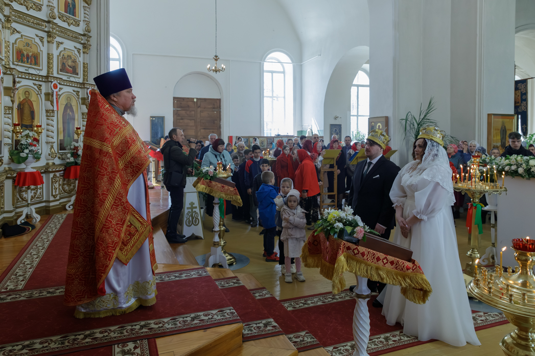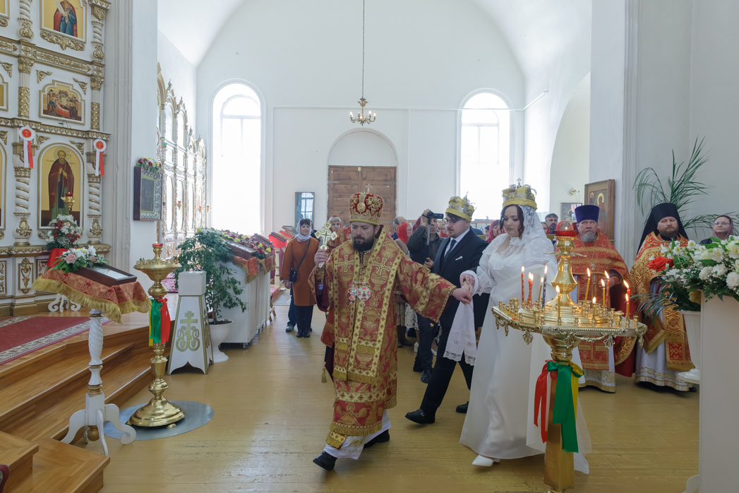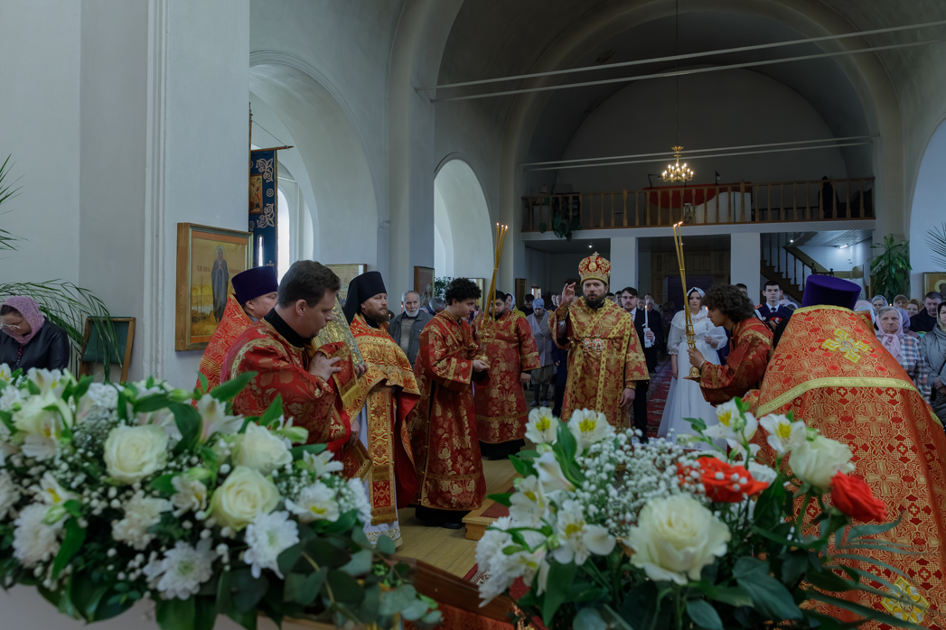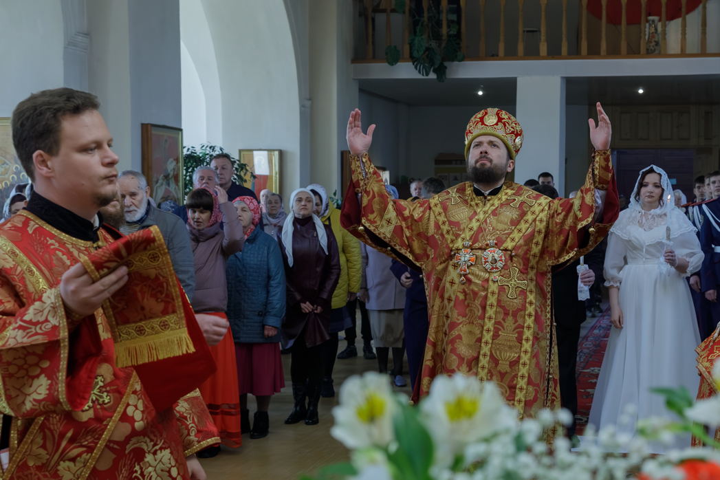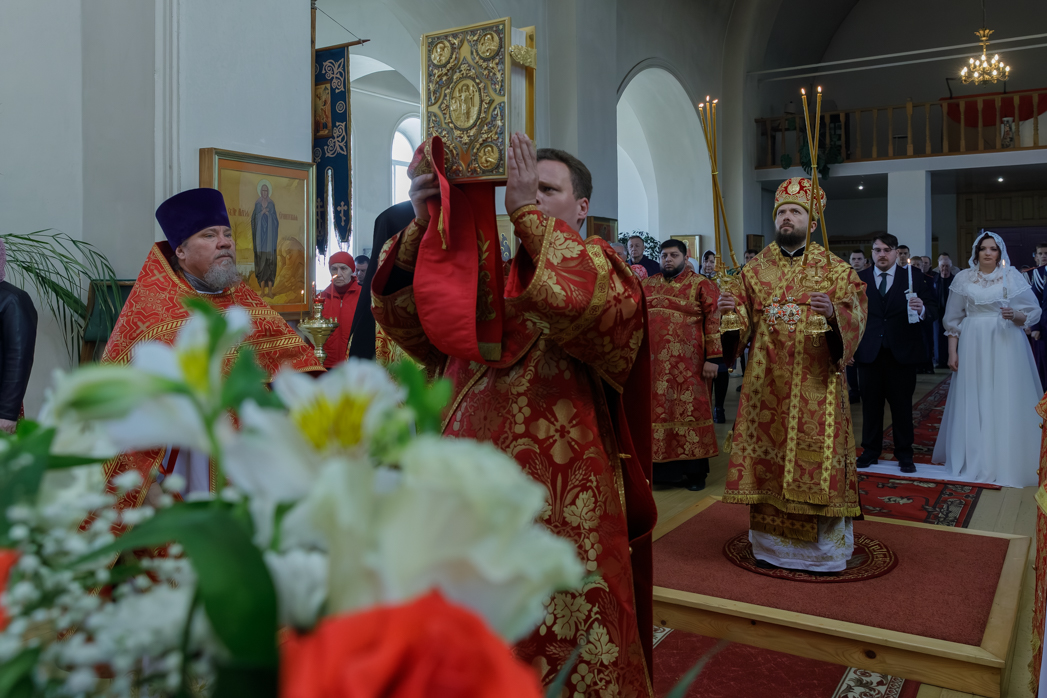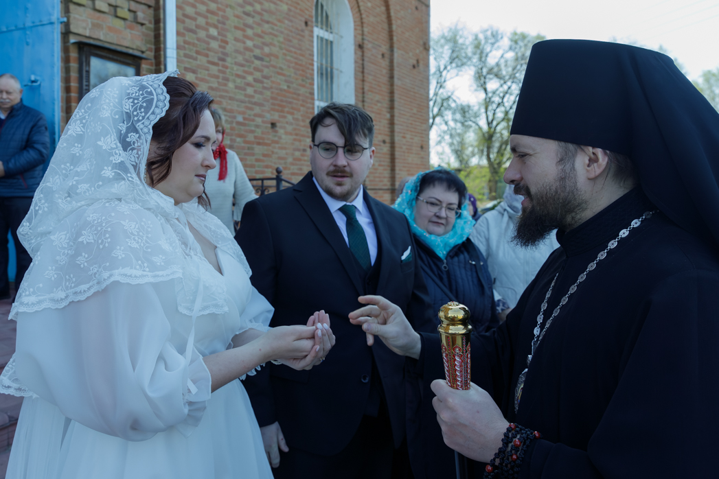 Далее, по окончании богослужения, епископ Дионисий обратился к новобрачным, а также всем собравшимся в храме с Архипастырским словом. В своей проповеди Владыка поздравил молодоженов, пожелал любви, взаимопонимания и долгой счастливой семейной жизни, приведя также слова апостола Павла: «Любовь долготерпит, милосердствует, любовь не завидует, любовь не превозносится, не гордится, не бесчинствует, не ищет своего, не раздражается, не мыслит зла, не радуется неправде, а сорадуется истине; все покрывает, всему верит, всего надеется, все переносит» (1Кор. 13:4-8).