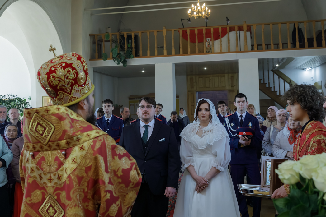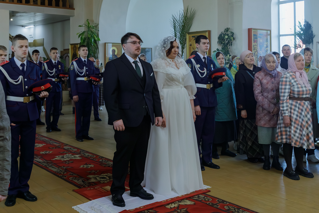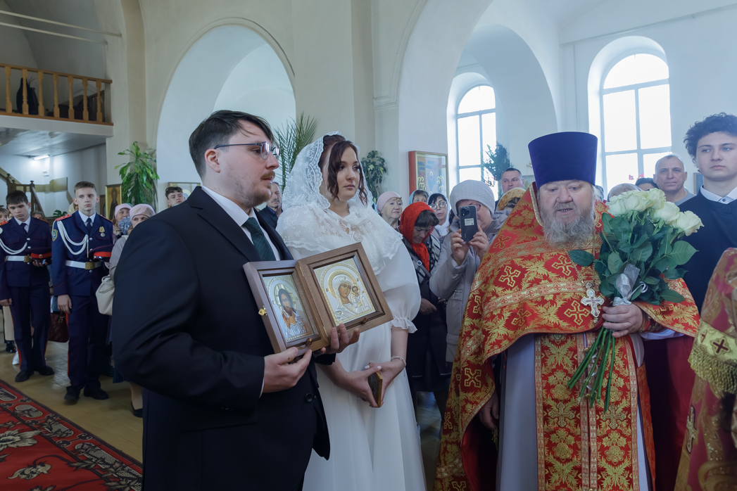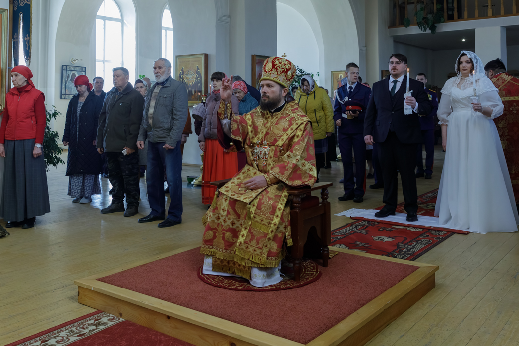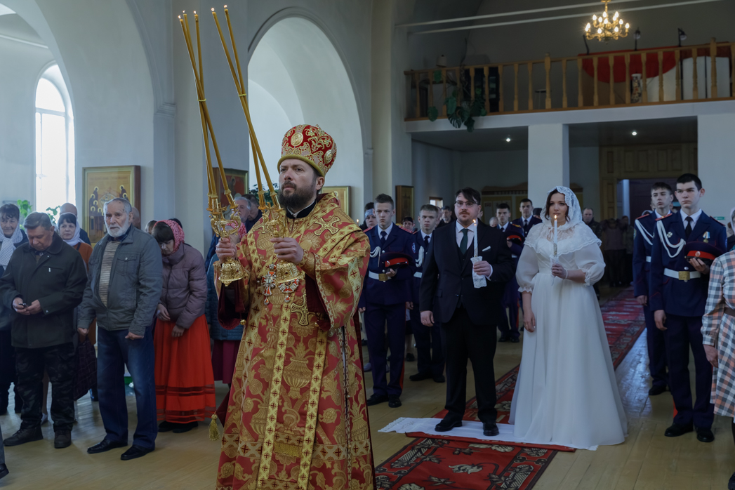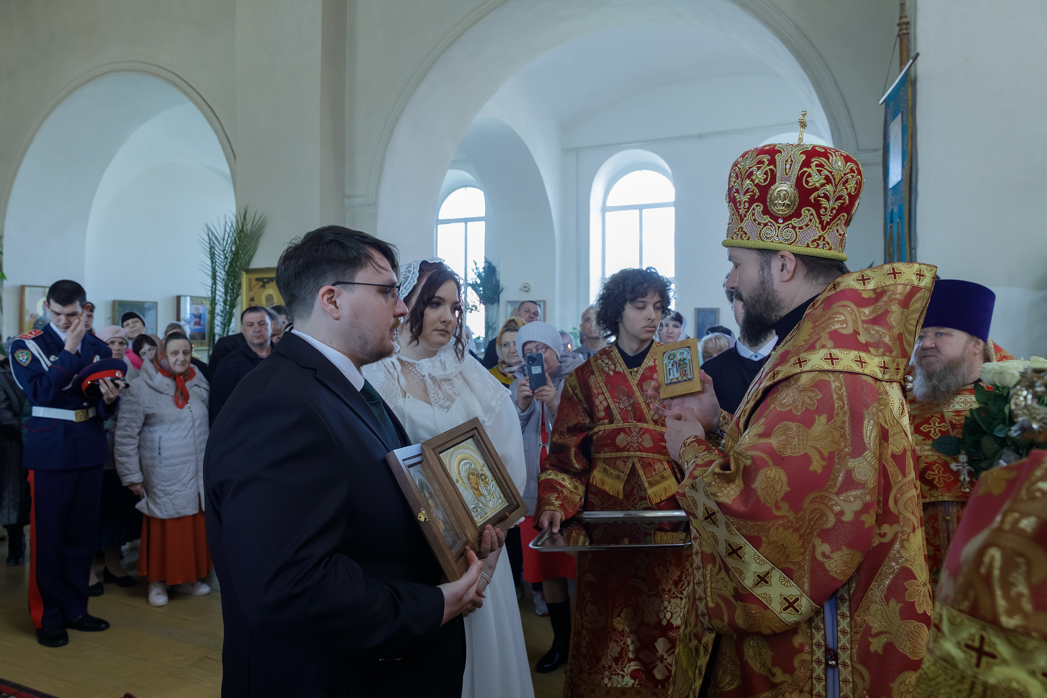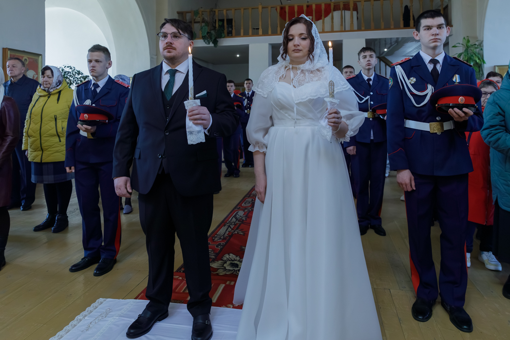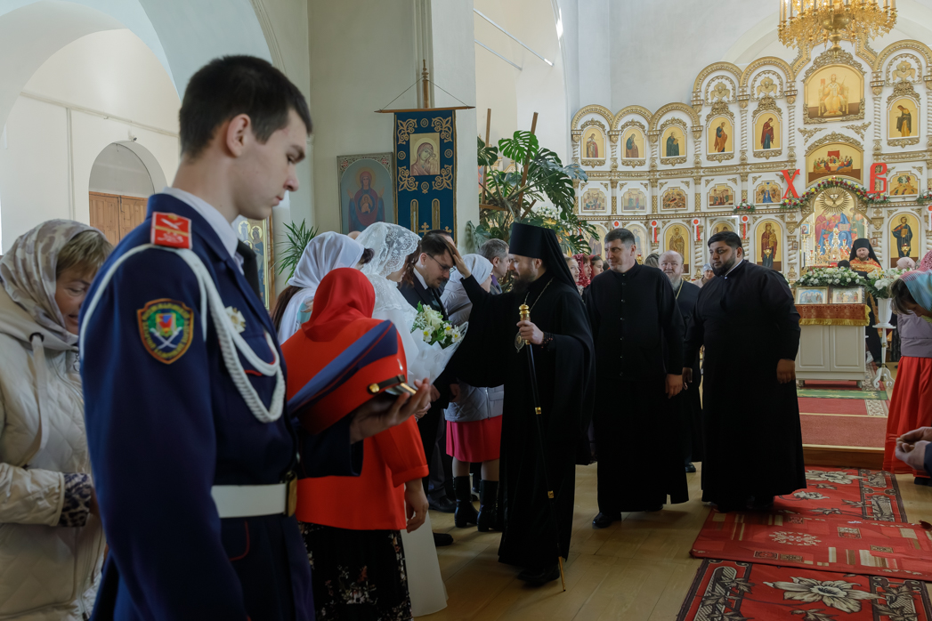 За богослужением молились брачующиеся Сергий и его избранница Татьяна, их родные и близкие, а также кадеты Верхнемамонского казачьего кадетского корпуса и прихожане храма, большинство из которых впервые смогли увидеть это красивое и торжественное Таинство, совершенное Архиереем.