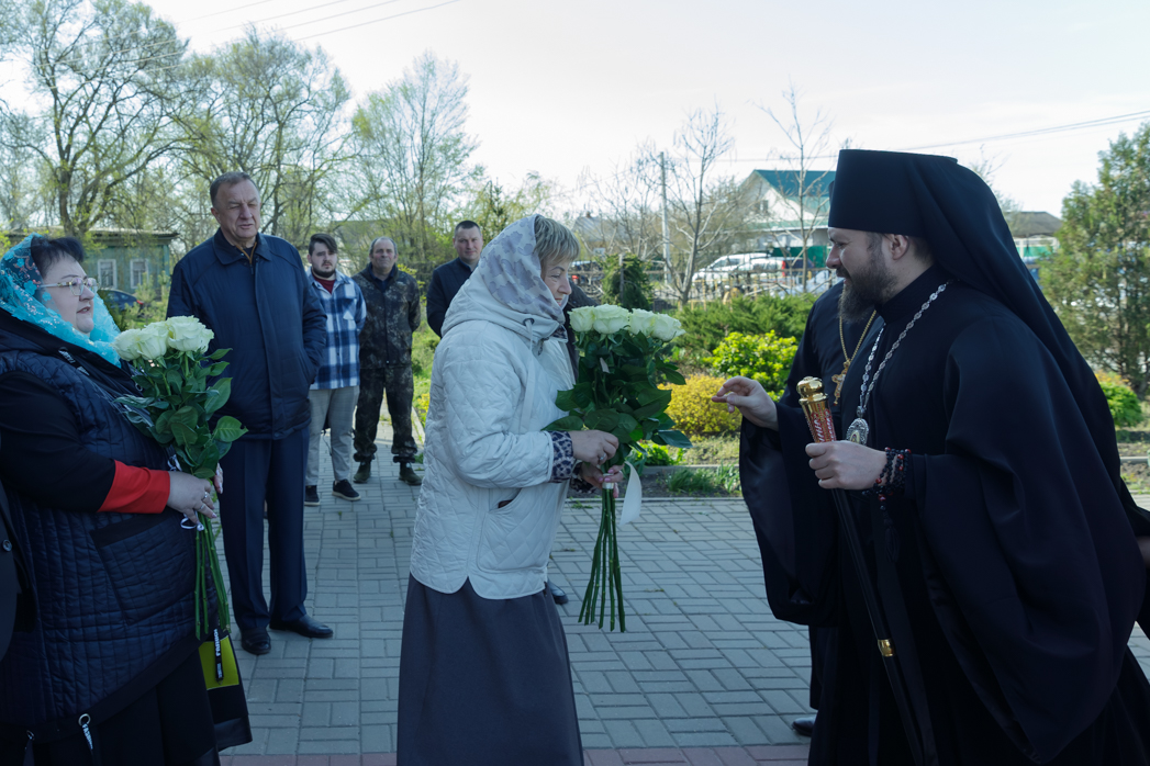 Затем с приветственным словом к Преосвященному Архипастырю обратился настоятель храма святителя Митрофана, первого епископа Воронежского, села Верхний Мамон, протоиерей Сергий Чибисов. Священнослужитель поблагодарил Владыку за визит и радость совместного молитвенного общения в особенный для прихода день, а также преподнес Ему в дар букет цветов и полный комплект Архиерейского облачения золотого (желтого) цвета.