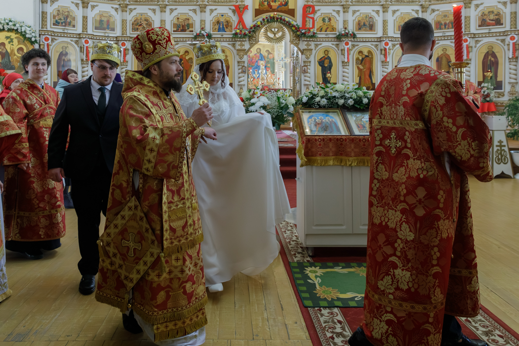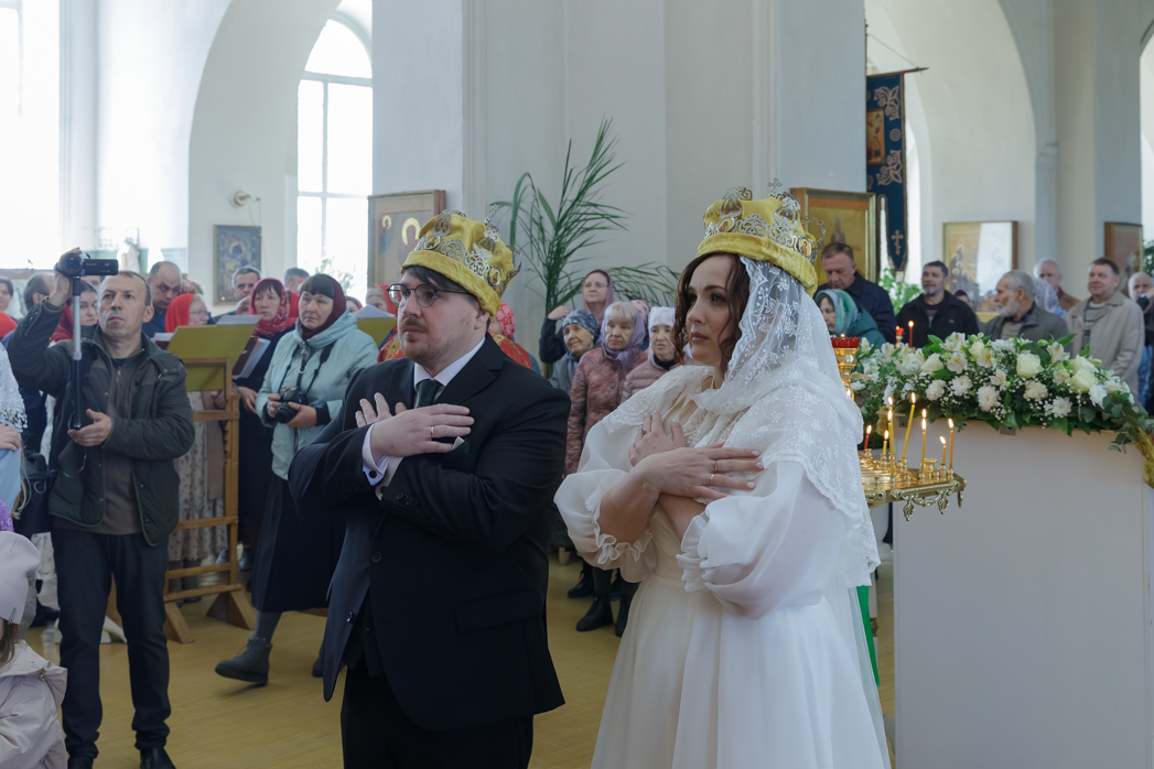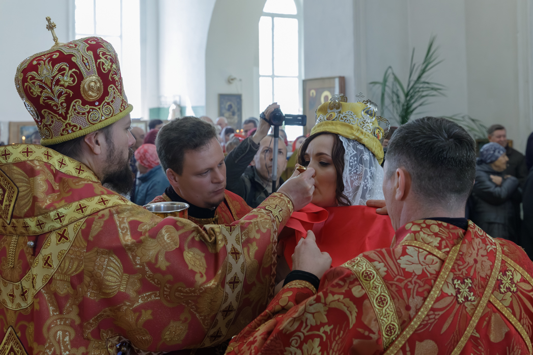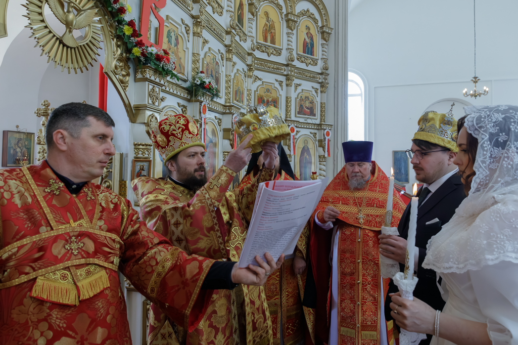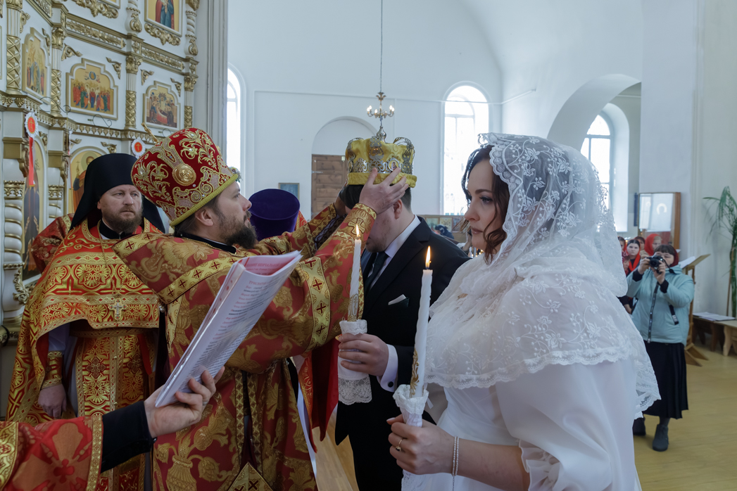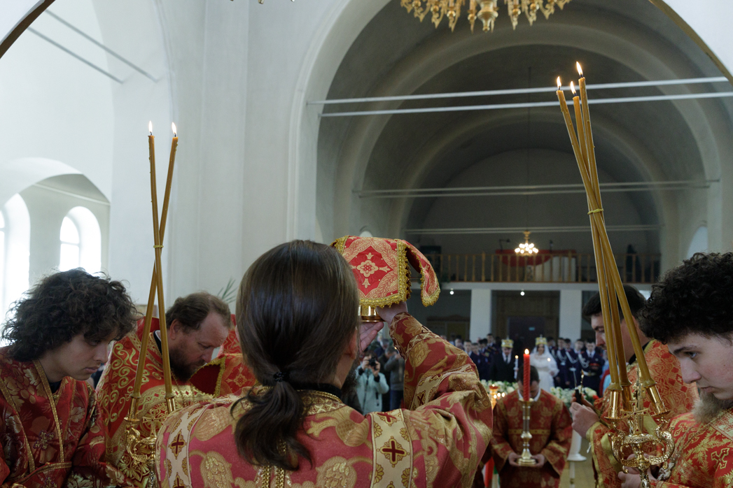 После малого входа на солее храма перед Царскими вратами Правящий Архиерей возложил венцы на сочетающихся браком, произнеся над ними одни из главных слов таинства: «Венчается раб Божий Сергий с рабою Божией Татианой во имя Отца, и Сына, и Святого Духа. Аминь… Господи Боже наш, славою и честью увенчай их!»