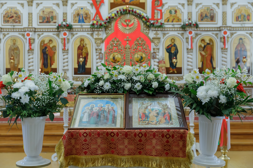 На молитвенную память Правящий Архиерей вручил Сергию и Татиане иконы Спасителя и Божией Матери, которые во время Литургии и Венчания находились на престоле, а также подарил образ святых равноапостольных царя Константина и матери Его царицы Елены.