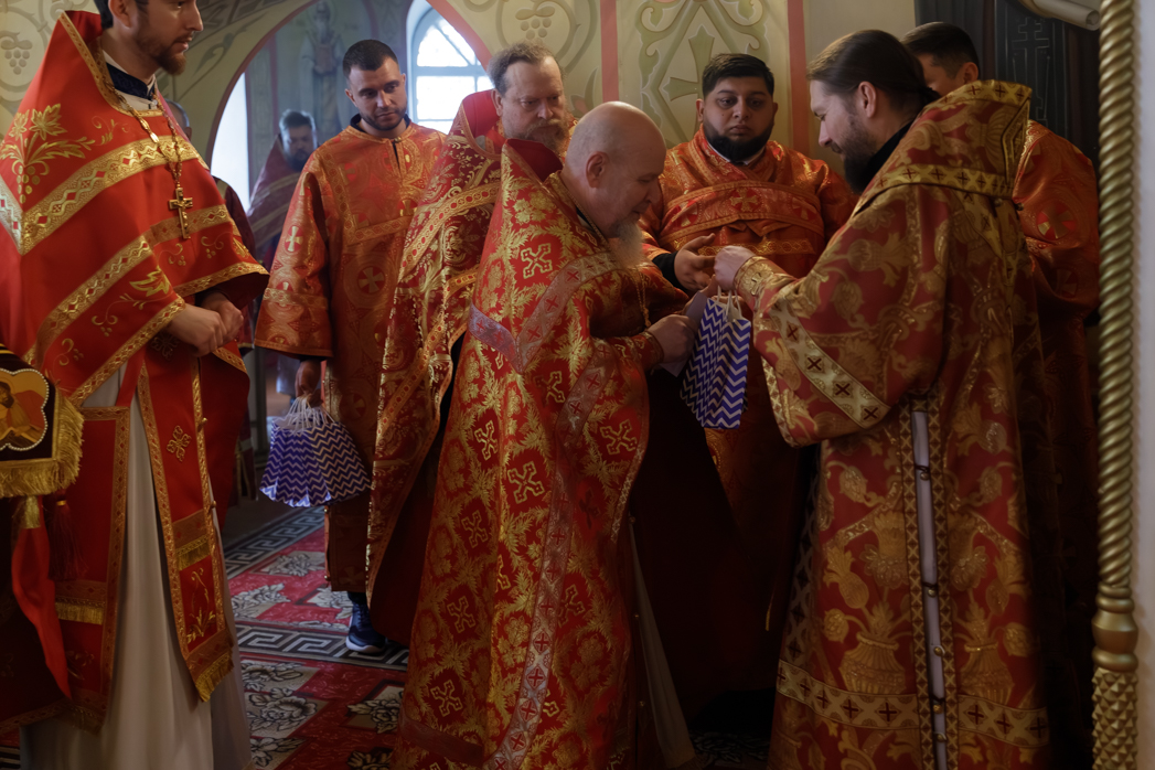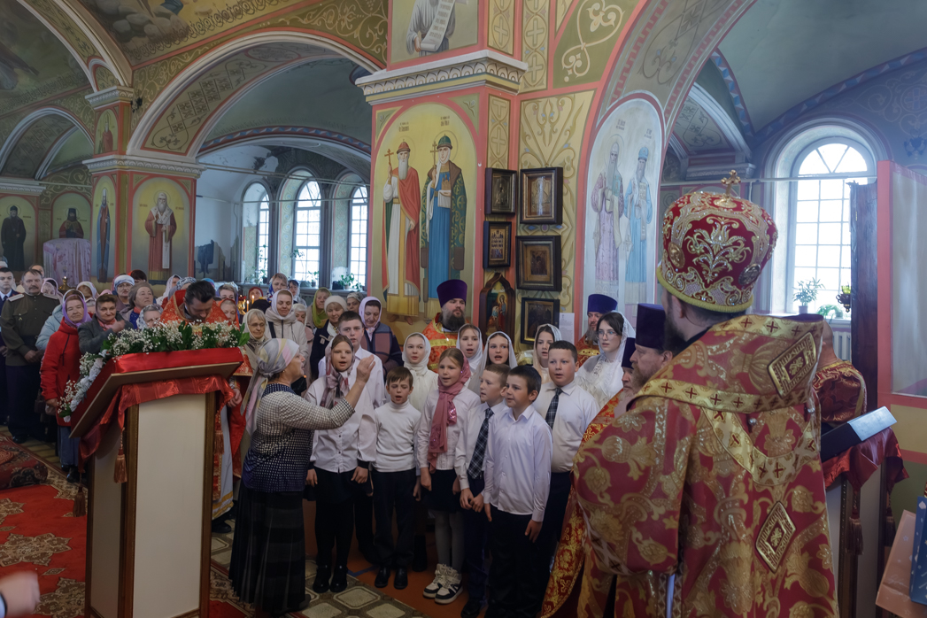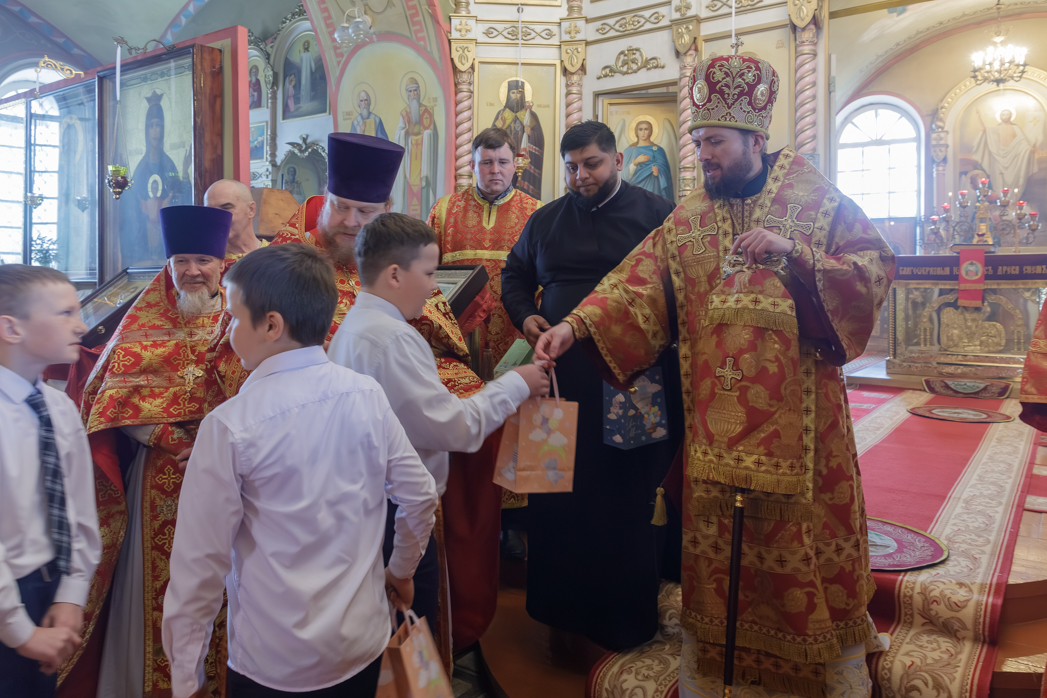 Затем воспитанники Воскресной школы храма поздравили Преосвященнейшего Владыку Дионисия, духовенство и всех присутствующих с праздником Светлого Христова Воскресения. По завершении выступления каждый выступающий получил архипастырский пасхальный подарок.