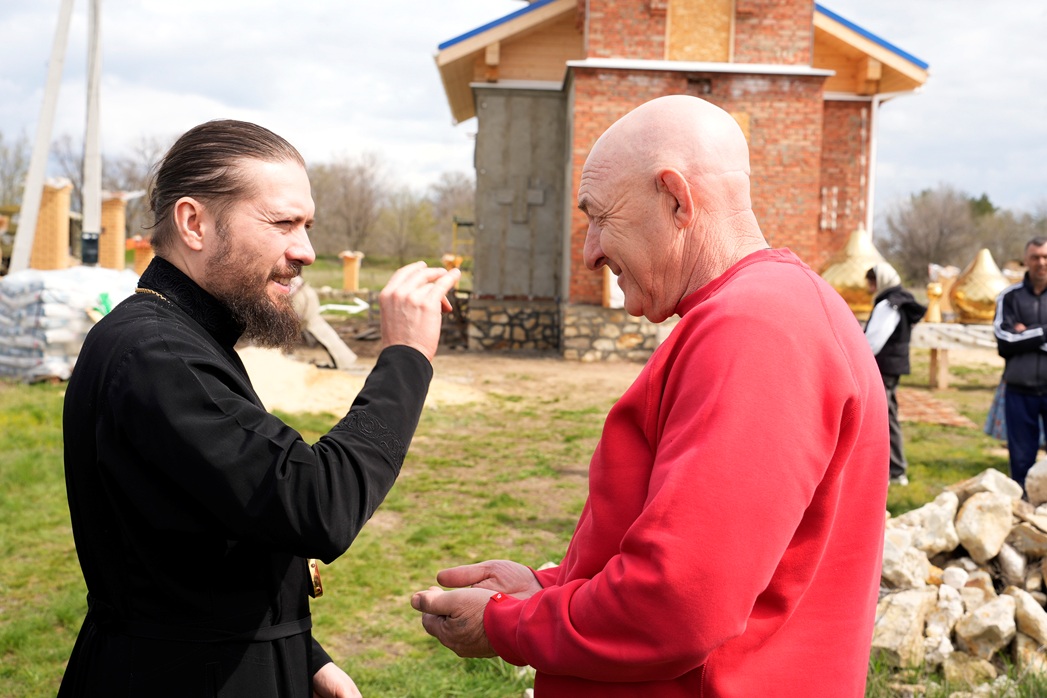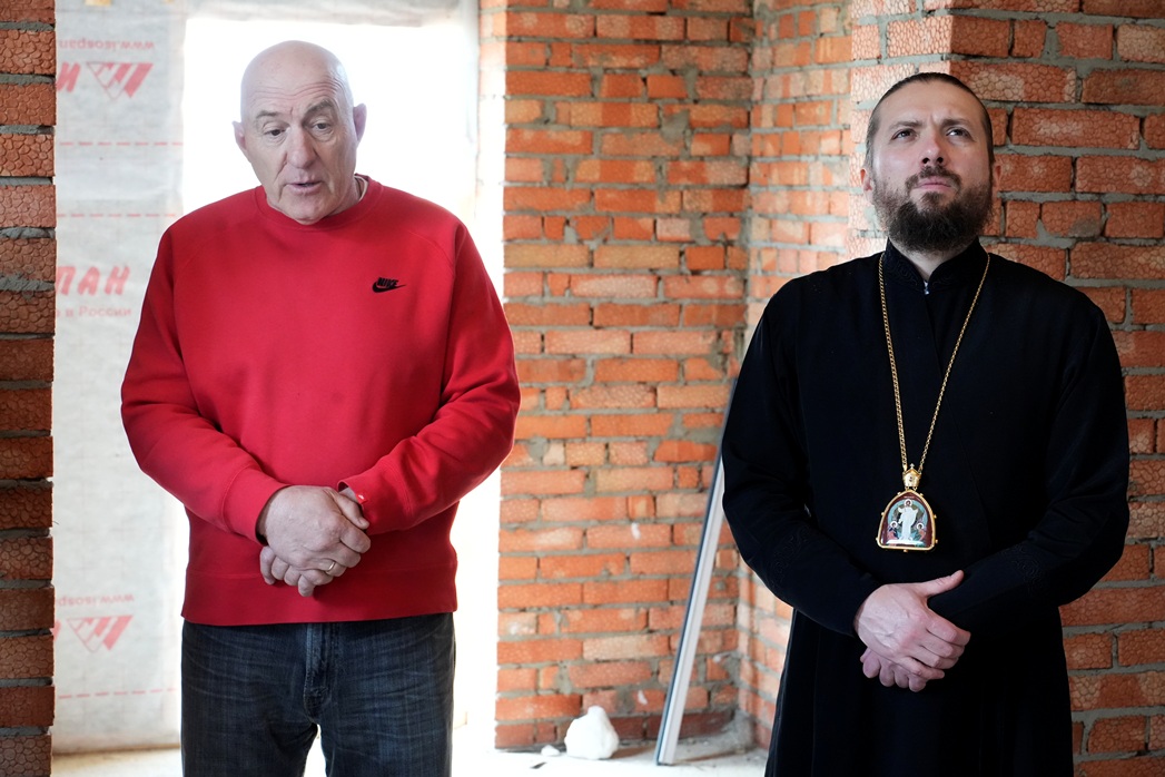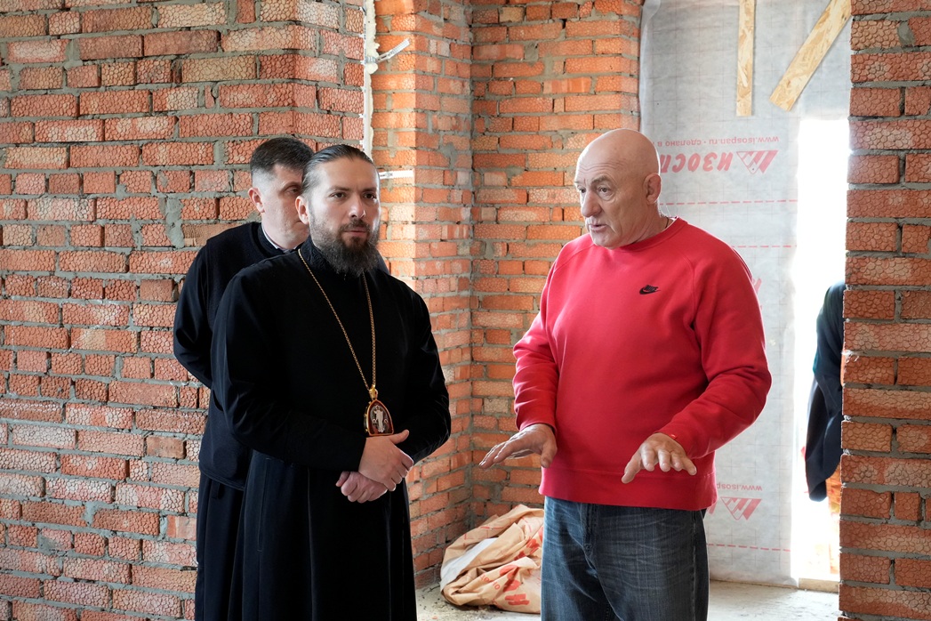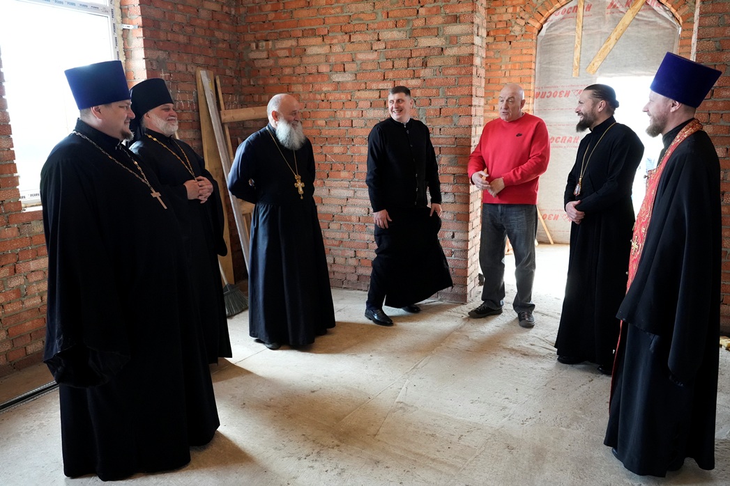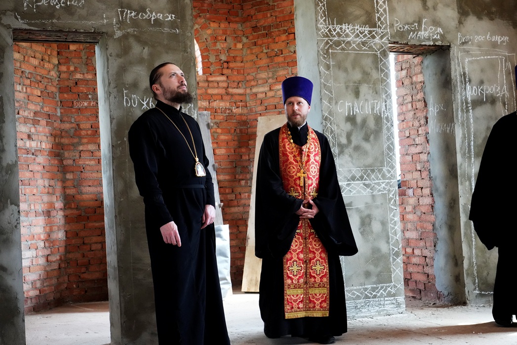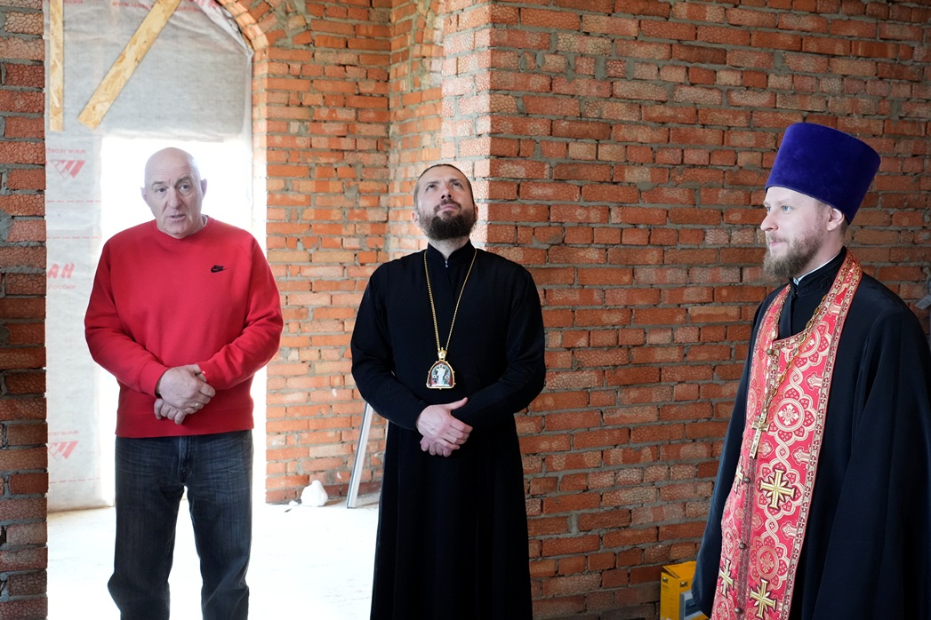 В начале визита Владыка совместно с духовенством и благотворителем осмотрел храм. С ходом строительных работ и планами на будущее Архипастыря познакомили иерей Ярослав Манохин и Олег Владимирович Волков.