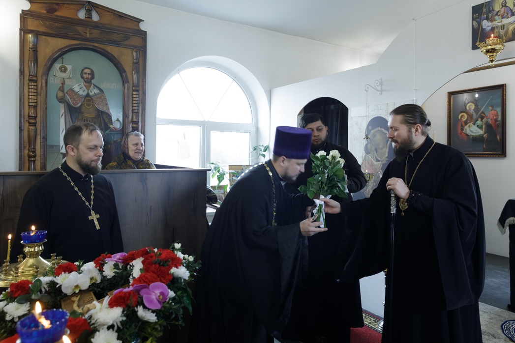 Затем с приветственным словом к Архипастырю обратился настоятель храма иерей Павел Белов. Священнослужитель поблагодарил епископа Дионисия за духовную радость совместного молитвенного общения. Затем иерей Павел преподнес Владыке букет цветов.