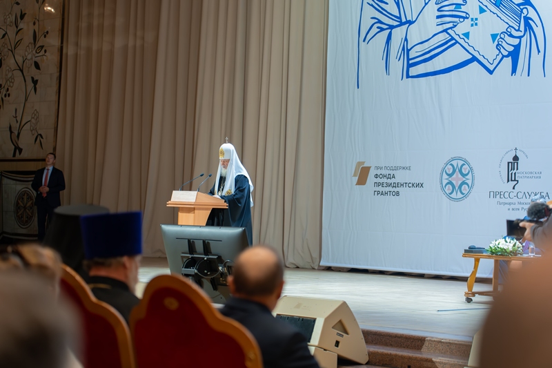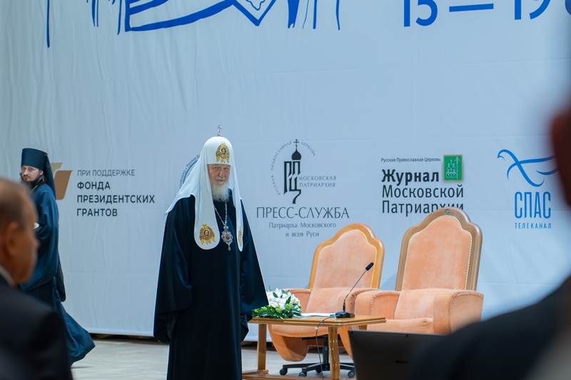 Предстоятель Русской Церкви со сцены Зала церковных соборов благословил участников форума и обратился к собравшимся с Первосвятительским словом.