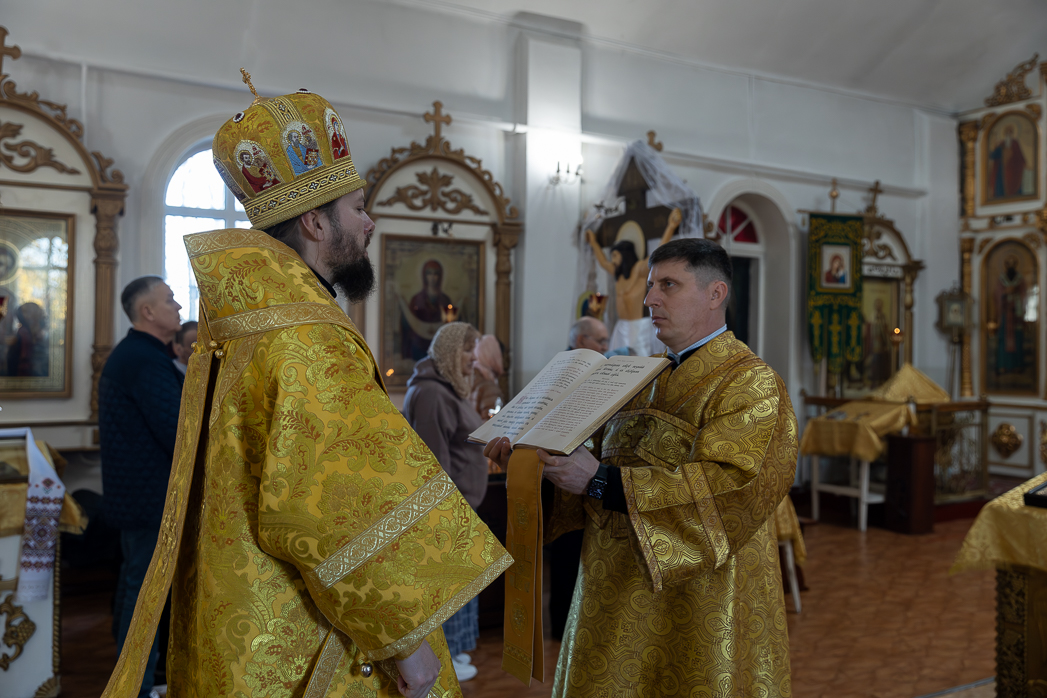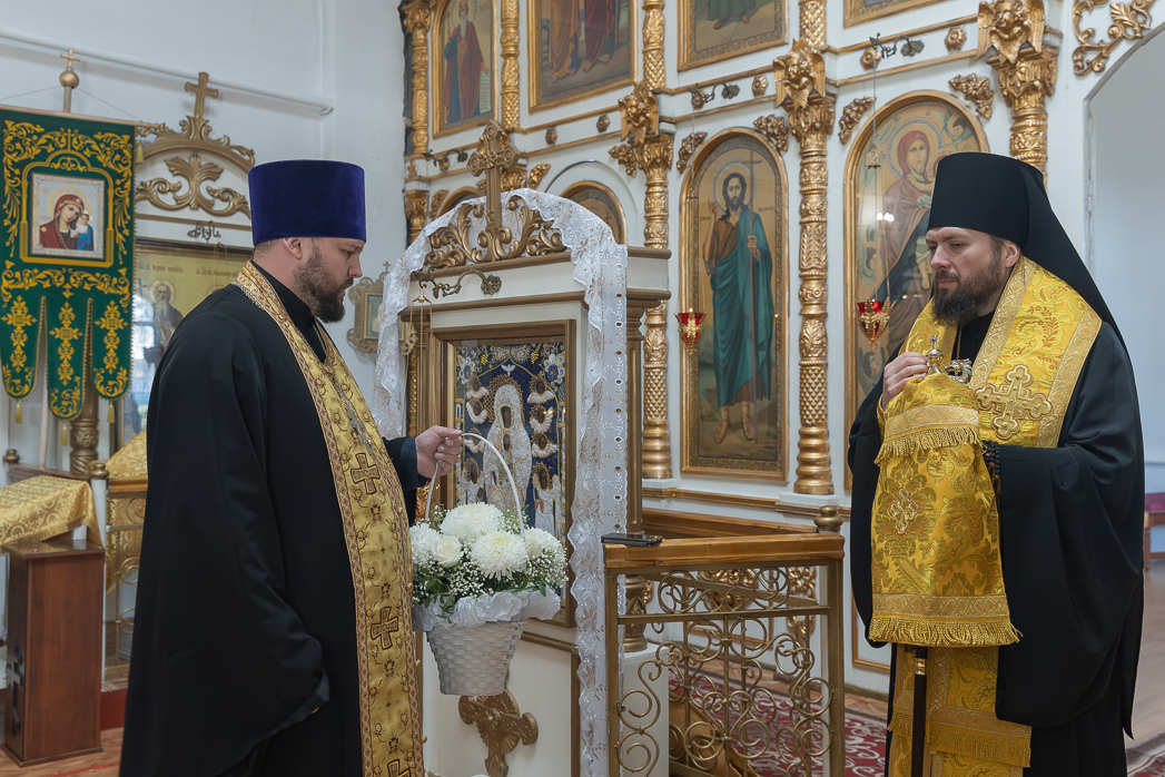 В завершении Литургии со словом приветствия к епископу Дионисию обратился настоятель храма иерей Артемий Дашенко. В знак сыновней любви священнослужитель преподнес Архипастырю букет цветов.