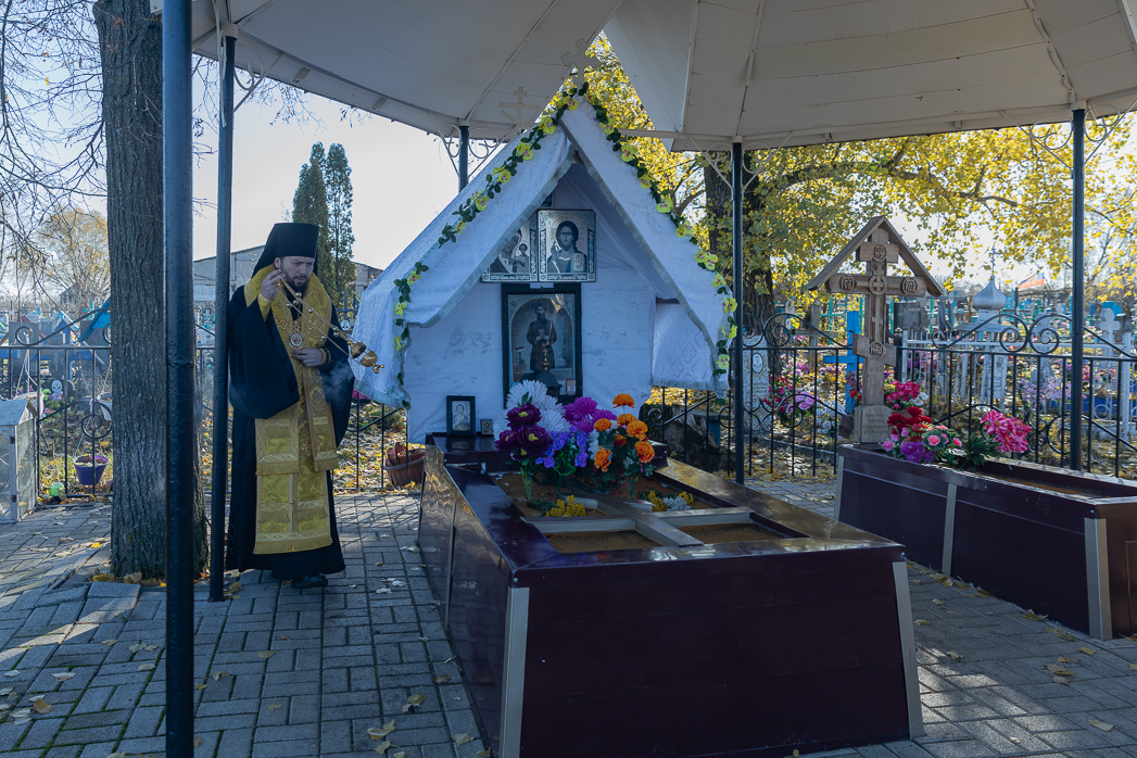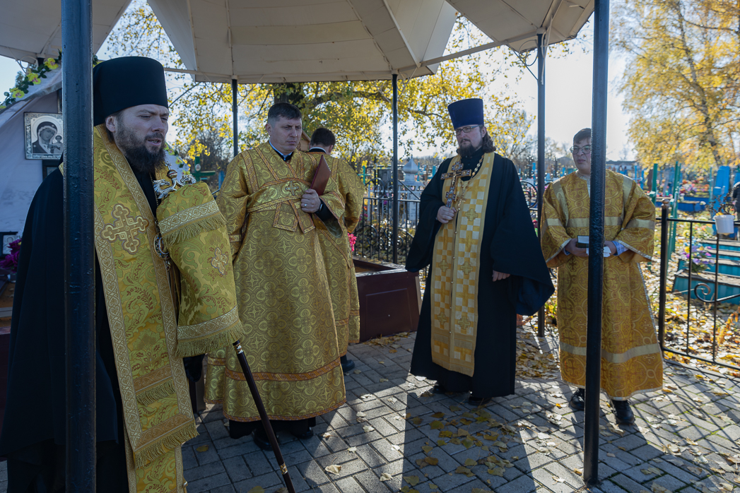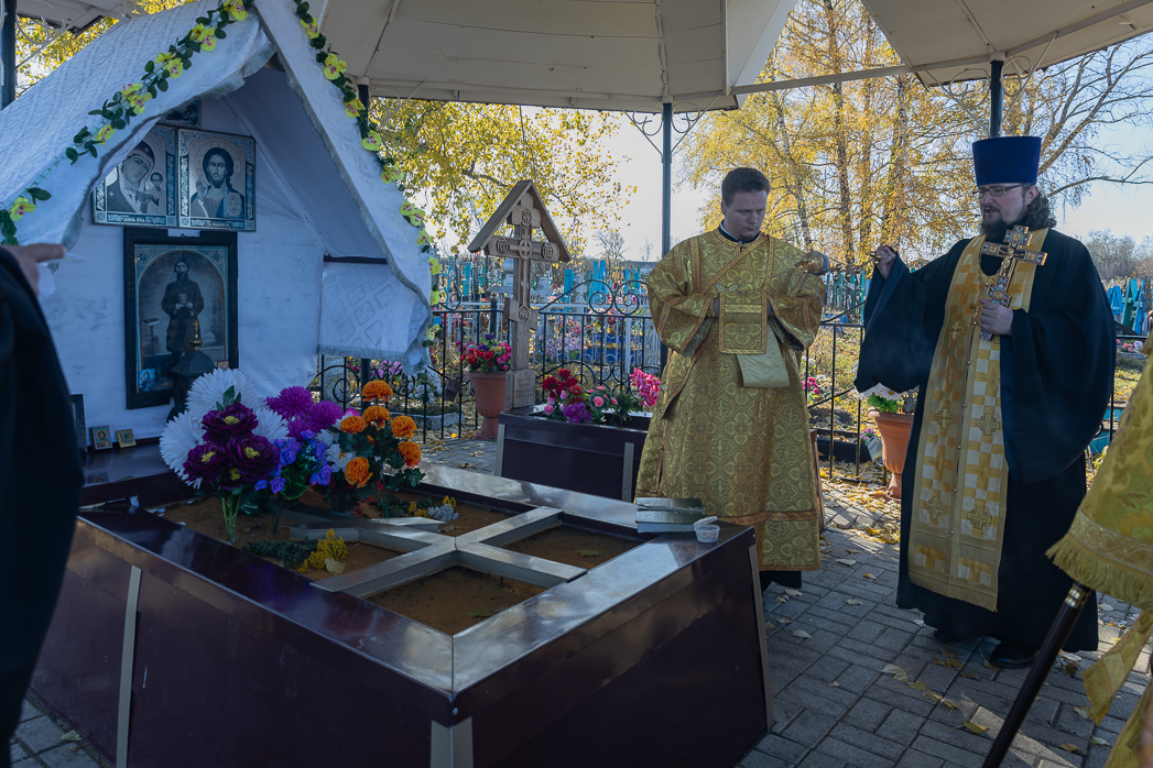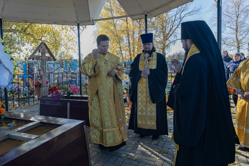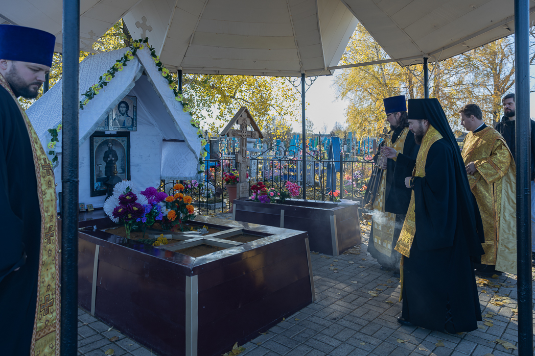 Затем Преосвященнейший Владыка проследовал на сельское кладбище, где возглавил панихиду на могиле почитаемого в народе старца Спиридона (Спиридона Григорьевича Сухинина).