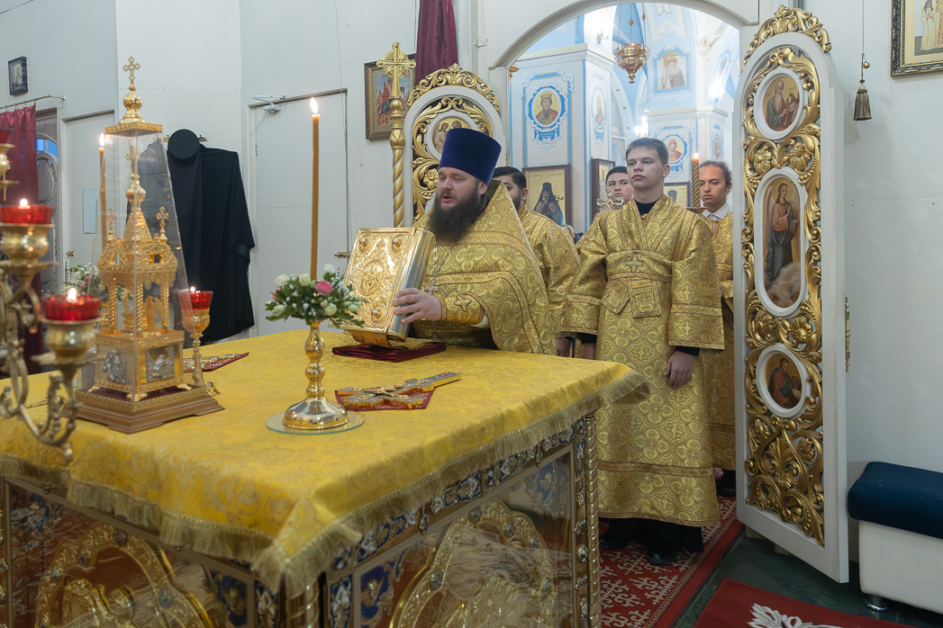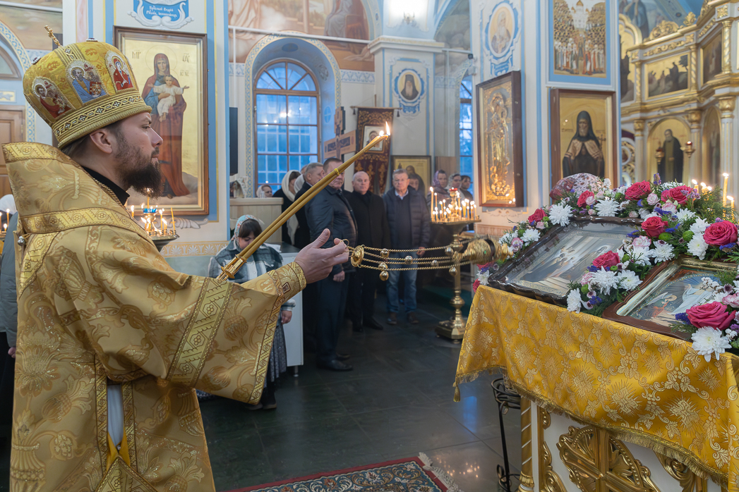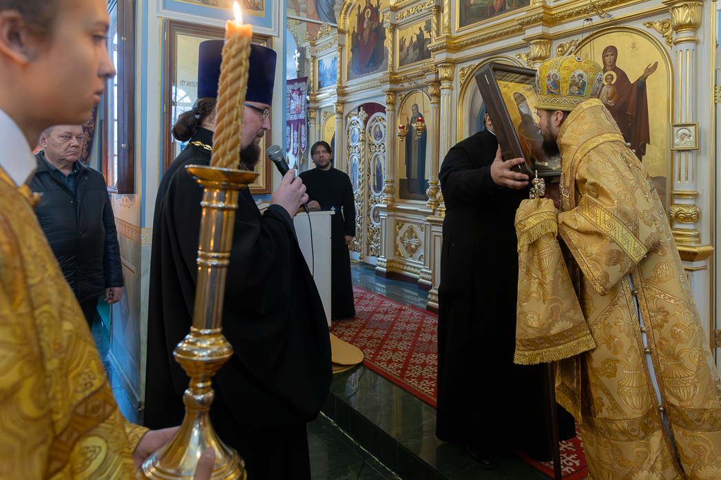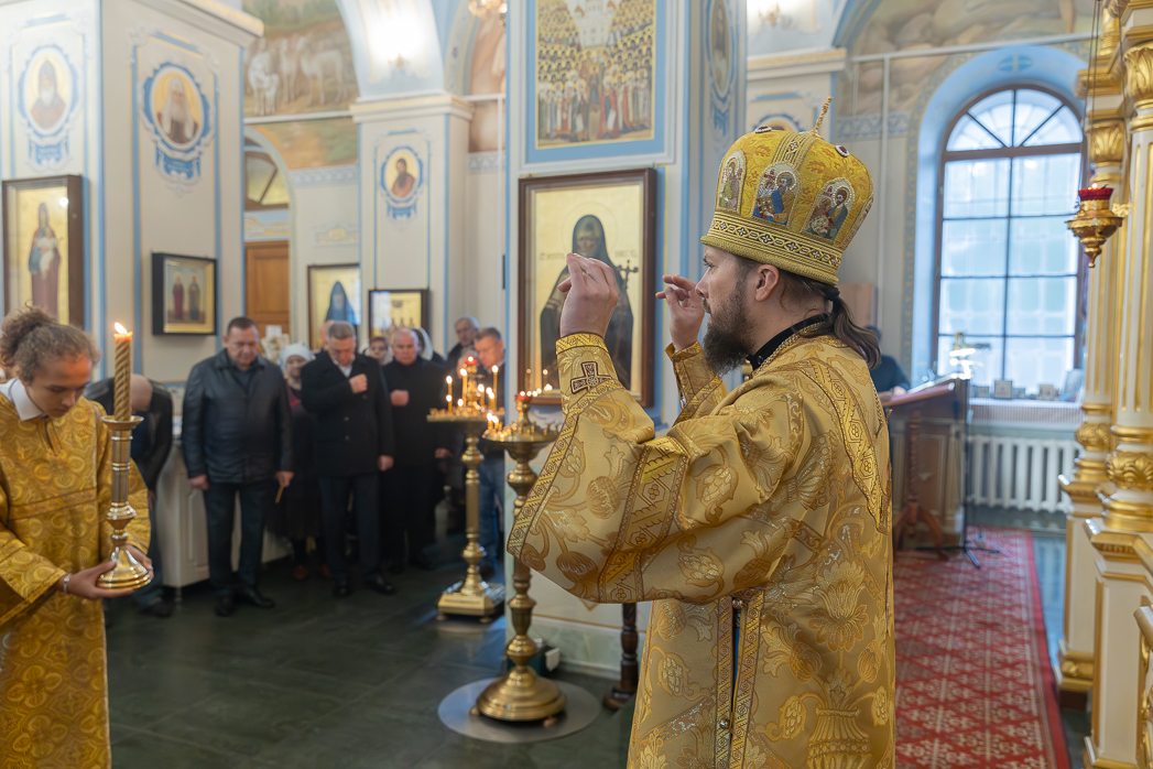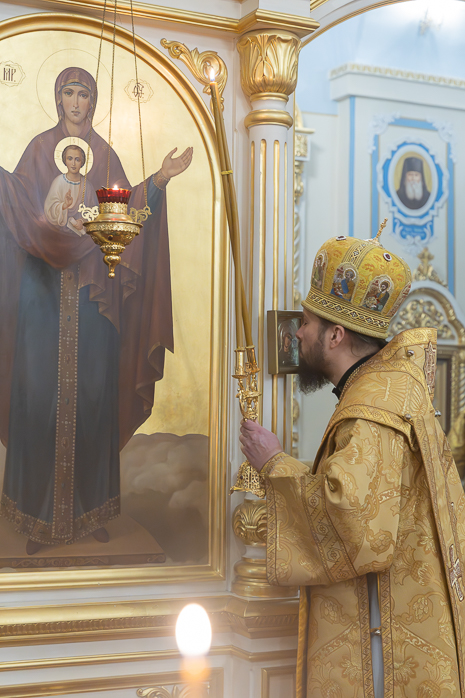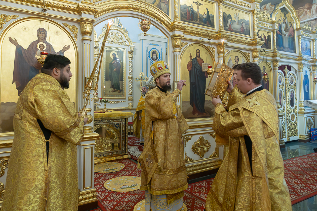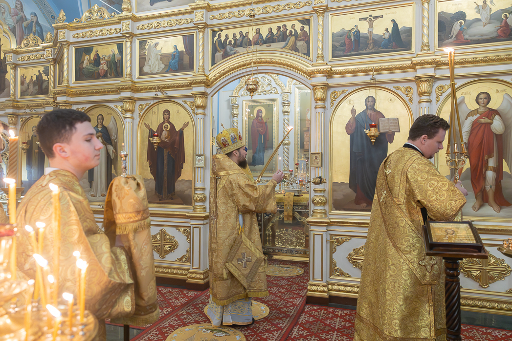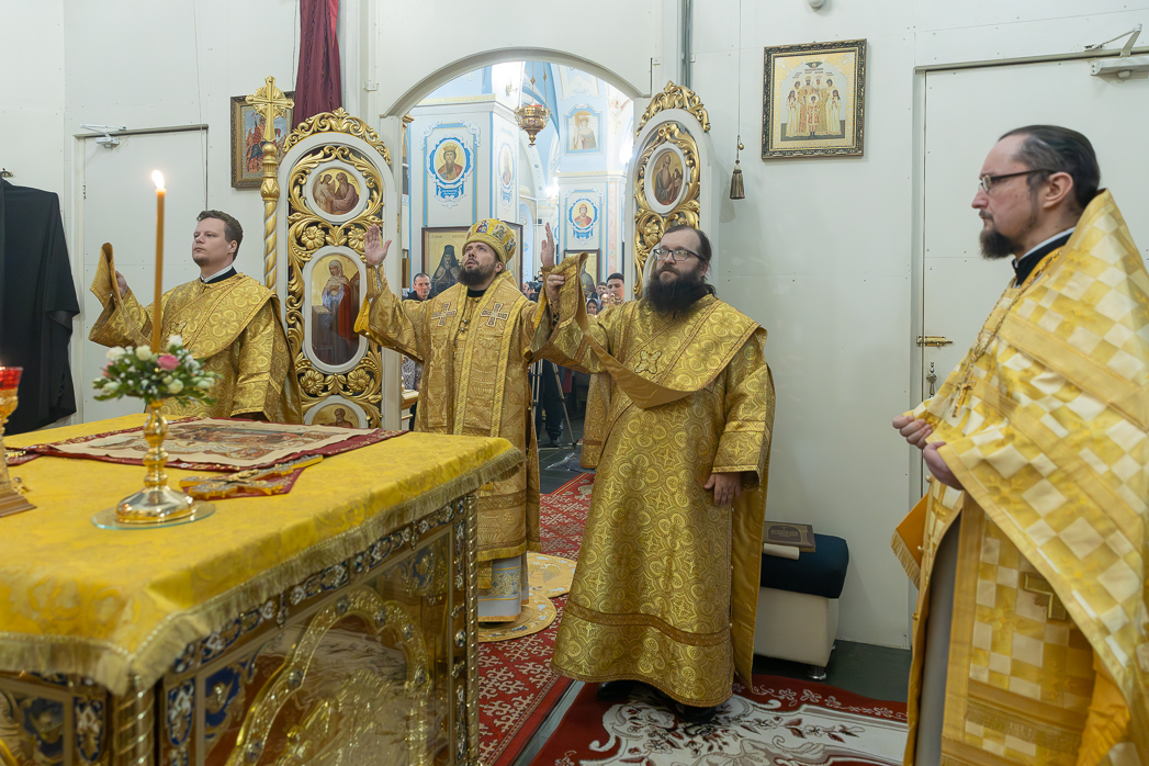 По завершении Литургии Преосвященнейший епископ Дионисий совершил освящение новоизготовленной росписи Тихоновского соборного храма.