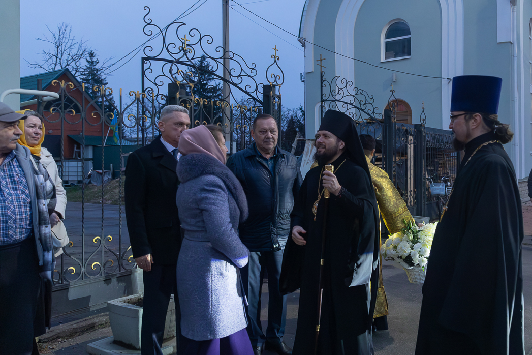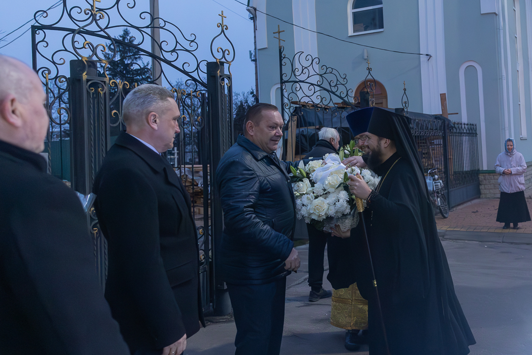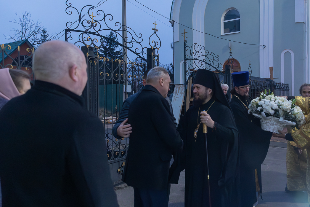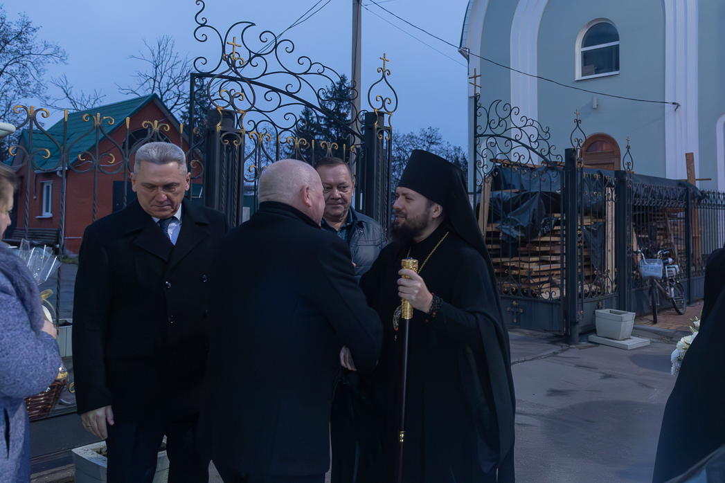 У храма Правящего Архиерея встречали: благочинный Острогожского церковного округа, настоятель храма иерей Алексий Курганский, глава администрации Острогожского муниципального района Сергей Иванович Хорошилов, генеральный директор ЗАО «Острогожсксадпитомник» Николай Иванович Гапоненко, генеральный директор «Воронежэнерго» Вячеслав Алексеевич Антонов, а также руководство города и района.