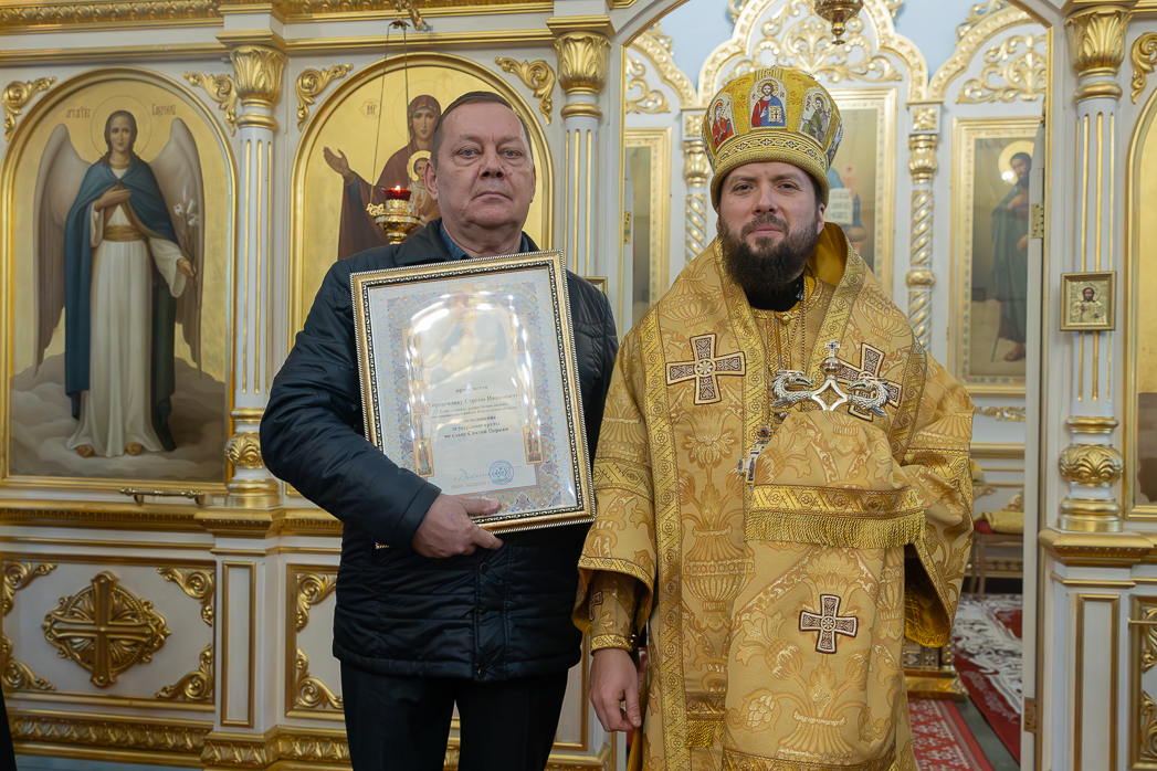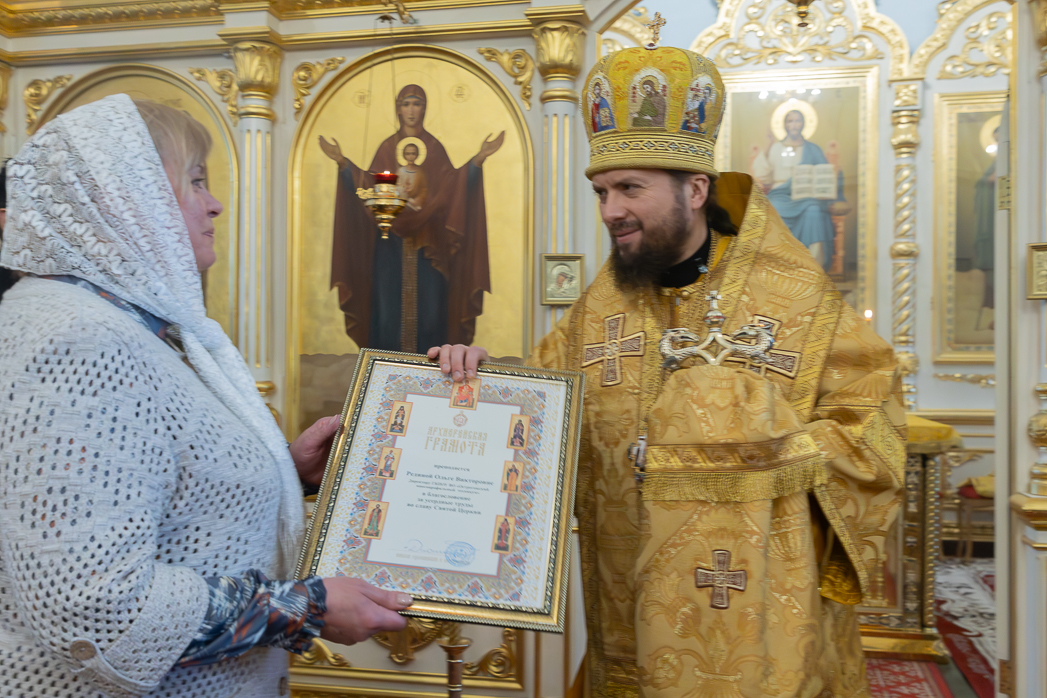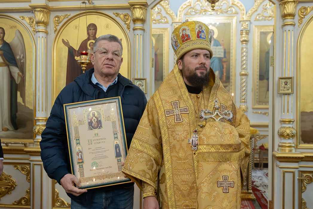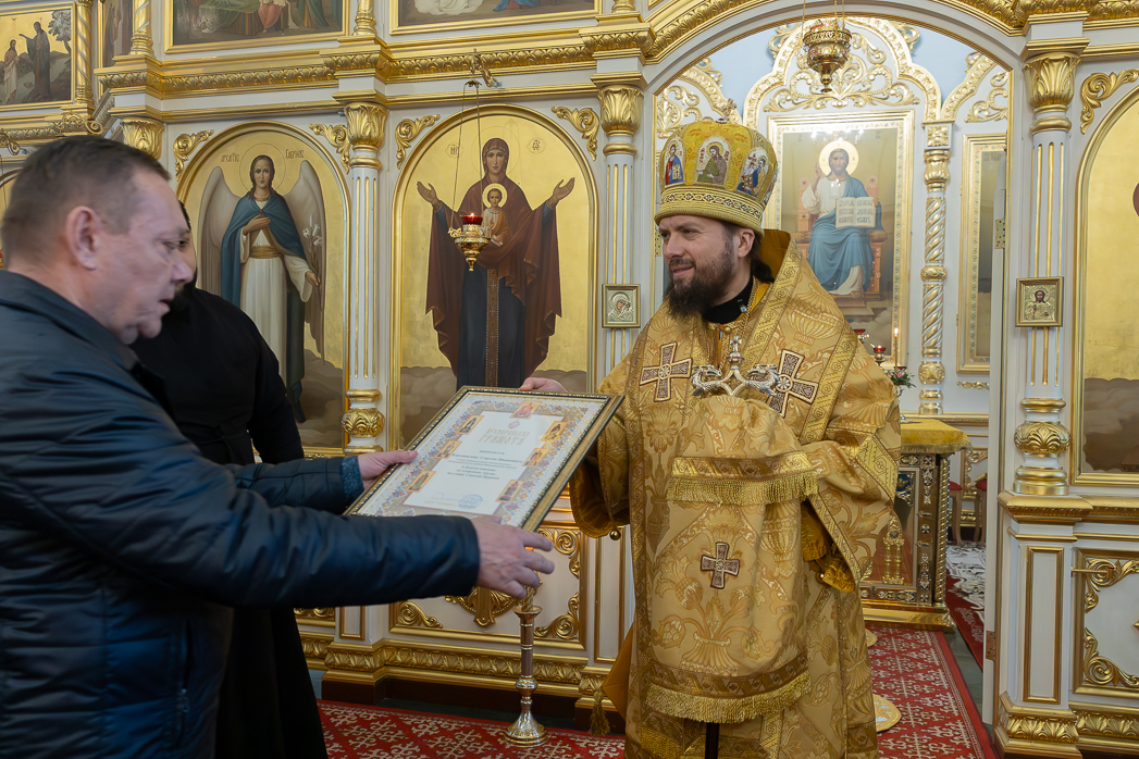 По завершении проповеди Правящий Архиерей вручил благотворителям и благоукрасителям храма церковные награды.