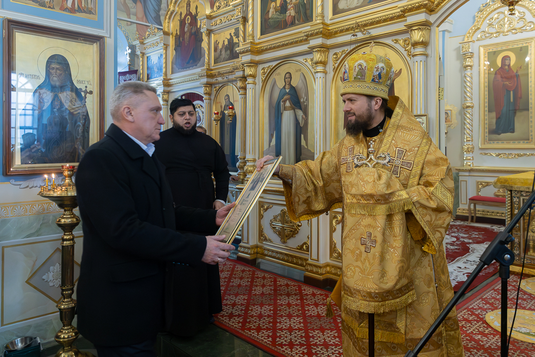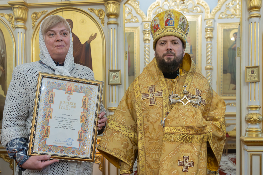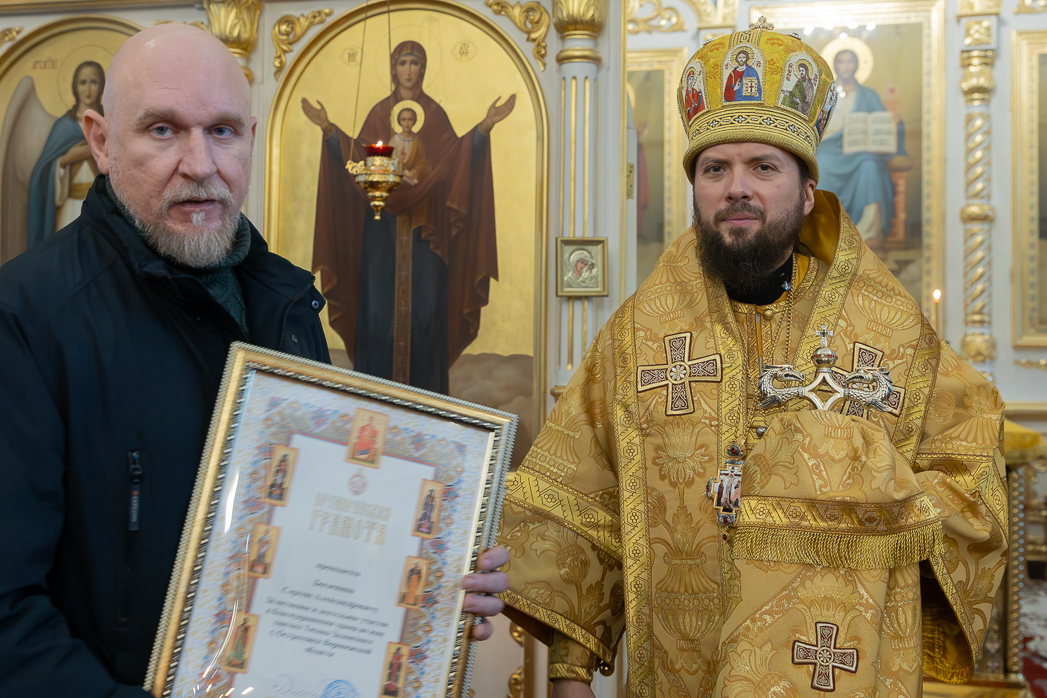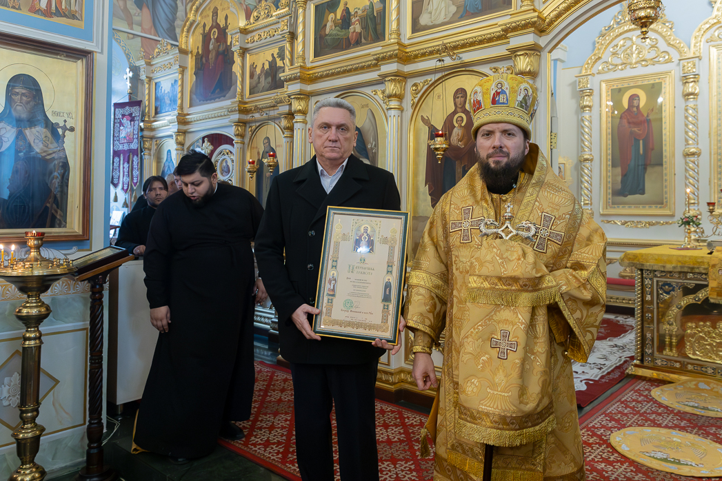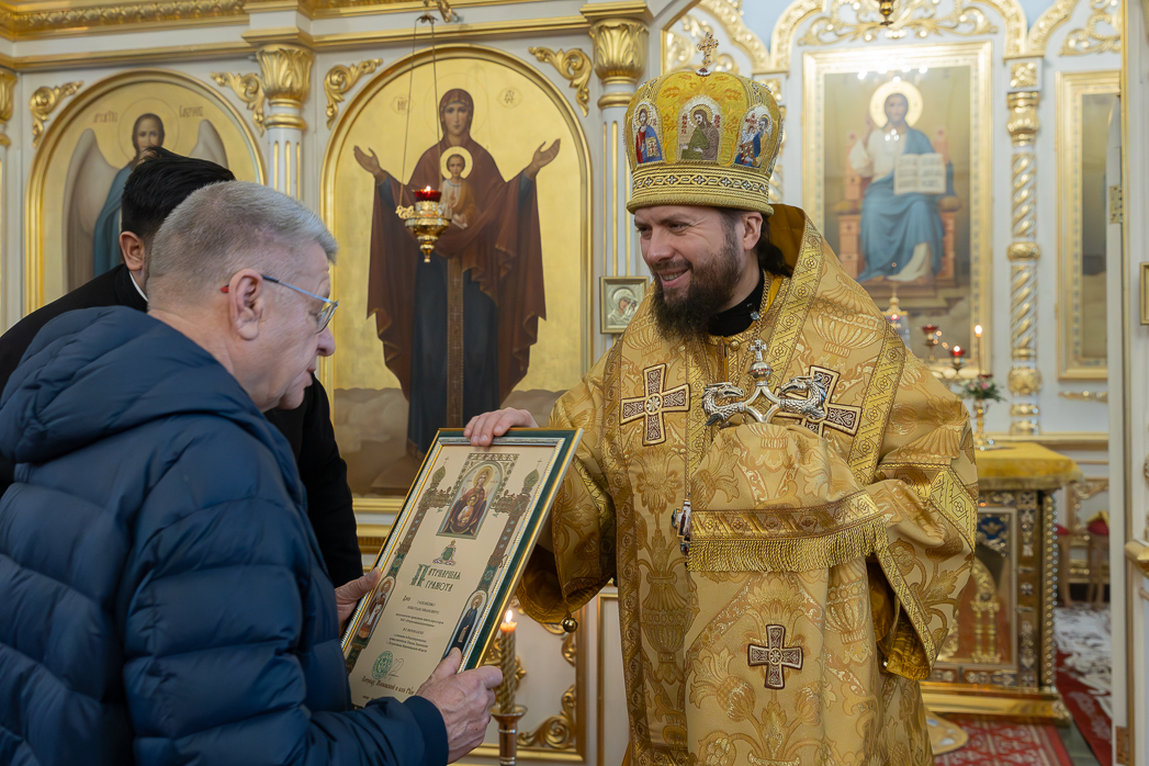 По завершении проповеди Правящий Архиерей вручил благотворителям и благоукрасителям храма церковные награды.