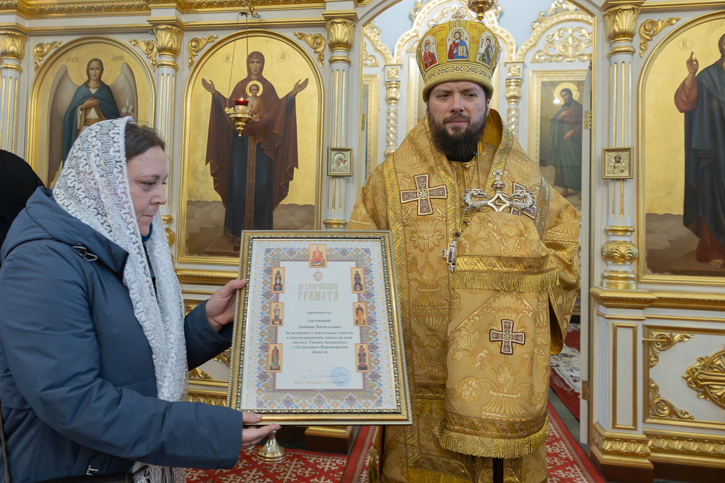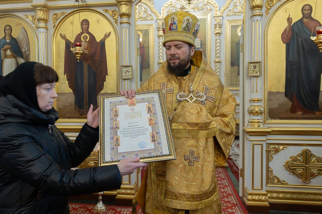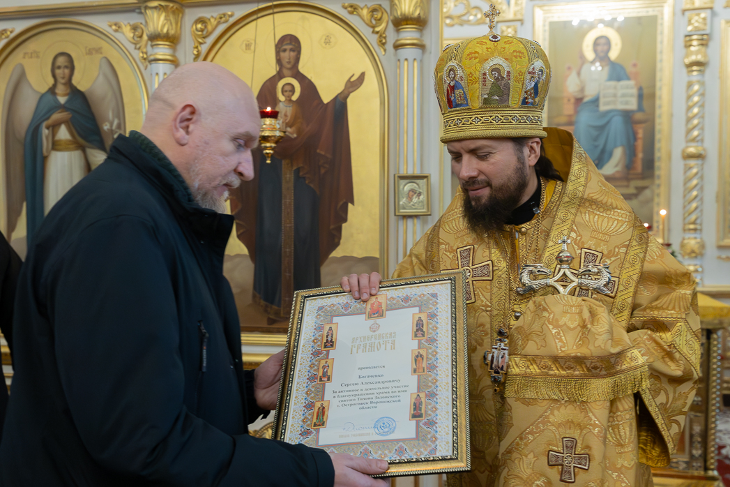 Затем глава администрации Острогожского муниципального района Сергей Иванович Хорошилов; директор ООО «Спецстрой Воронеж» Сергей Валентинович Загоруля; директор Острогожского Многопрофильного техникума Ольга Викторовна Редина и художники-иконописцы: Сергей Александрович Богаченко, Юлия Егоровна Кожухова, Наталья Александровна Корчагина, Любовь Васильевна Антонова, Анастасия Андреевна Бортенева – удостоены Архиерейских грамот.