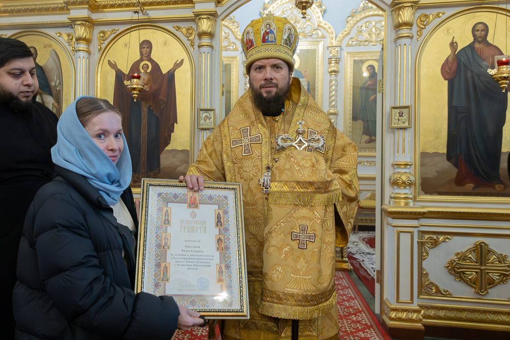 Его Преосвященству сослужили: секретарь Россошанского епархиального управления иерей Иаков Калинин, благочинный Острогожского церковного округа, настоятель храма иерей Алексий Курганский, настоятель храма Преображения Господня города Острогожска иерей Константин Луцкевич и клирик Тихоновского соборного храма города Острогожска иерей Олег Потапов.