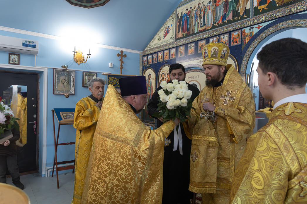 После отпуста Литургии со словом приветствия к епископу Дионисию обратился настоятель храма Рождества Пресвятой Богородицы города Россошь протоиерей Андрей Плугатырев. Священнослужитель поблагодарил Владыку за радость совместного молитвенного общения и в знак сыновней любви преподнес в дар Архипастырю букет цветов.