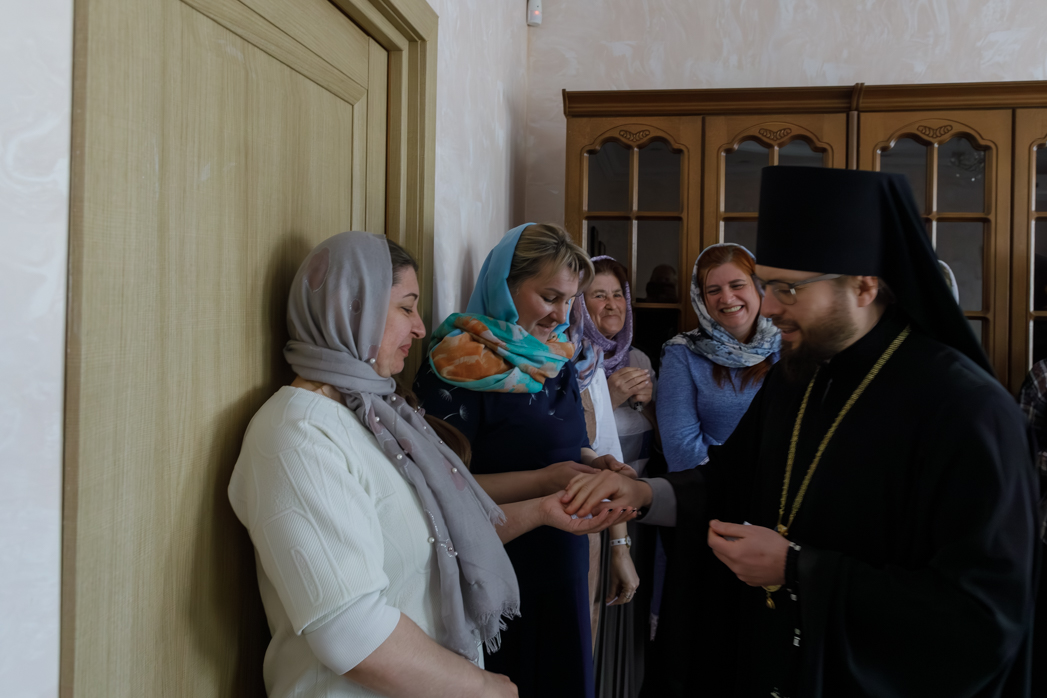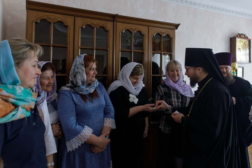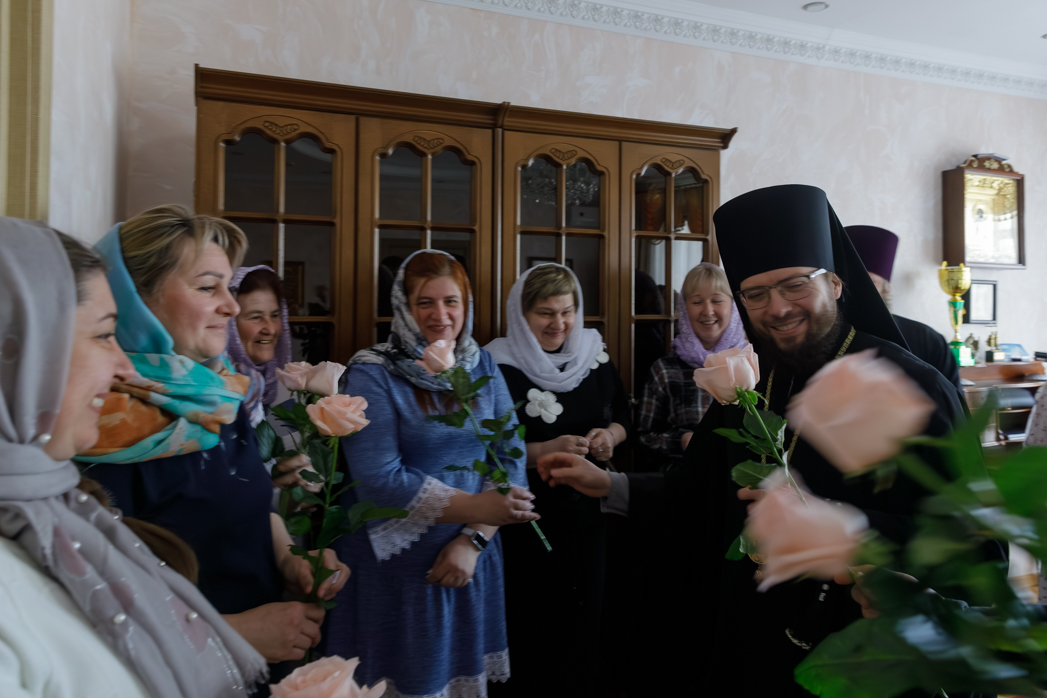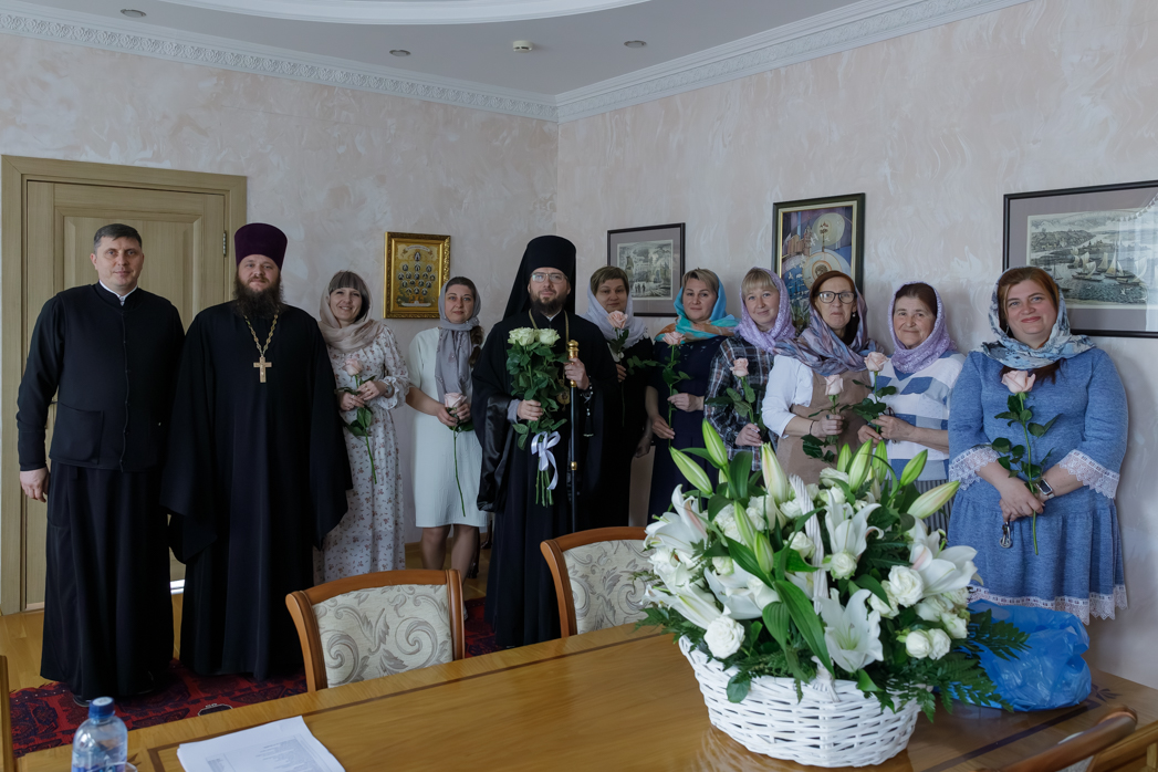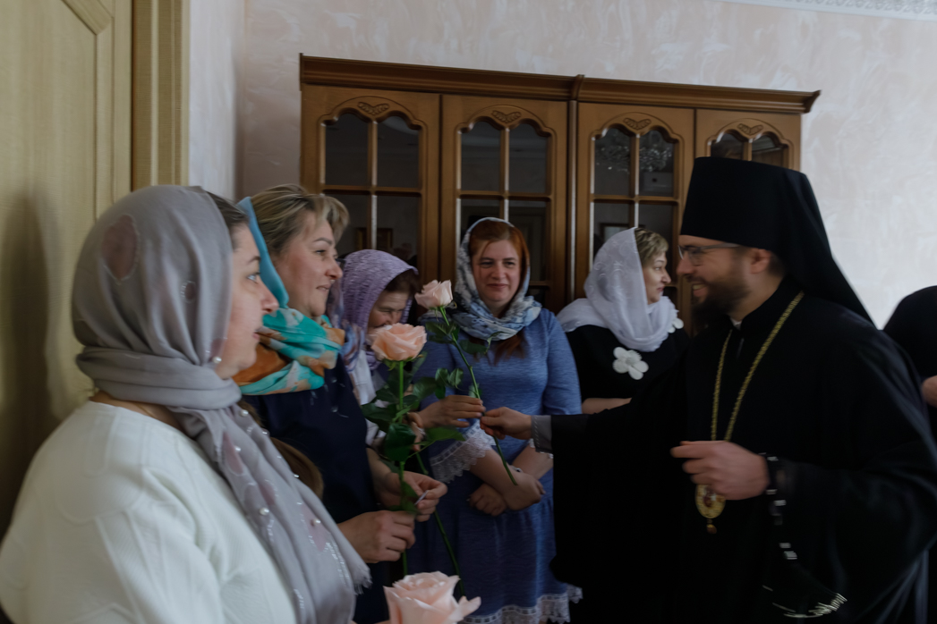 По случаю отмечаемого в прошедшее воскресенье дня памяти святых жен-мироносиц епископ Дионисий поздравил прекрасную половину сотрудниц епархиального управления, сердечно поблагодарил их за добросовестные труды и ответственное отношение к возложенным обязанностям, пожелал крепкого здоровья и Божией помощи в жизни. Каждой участнице встречи Владыка вручил цветы и памятный подарок.