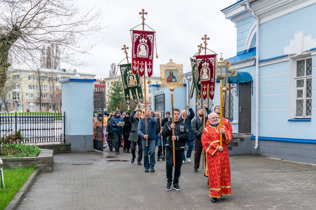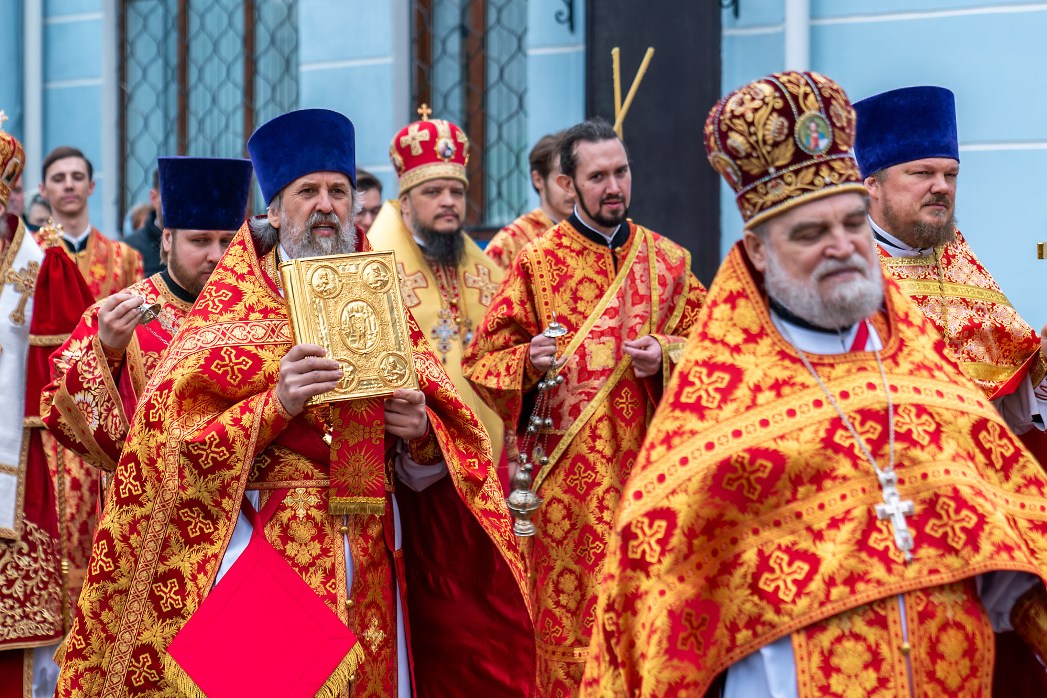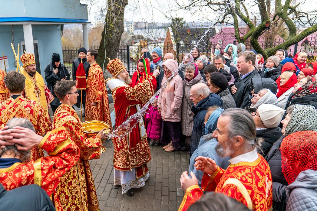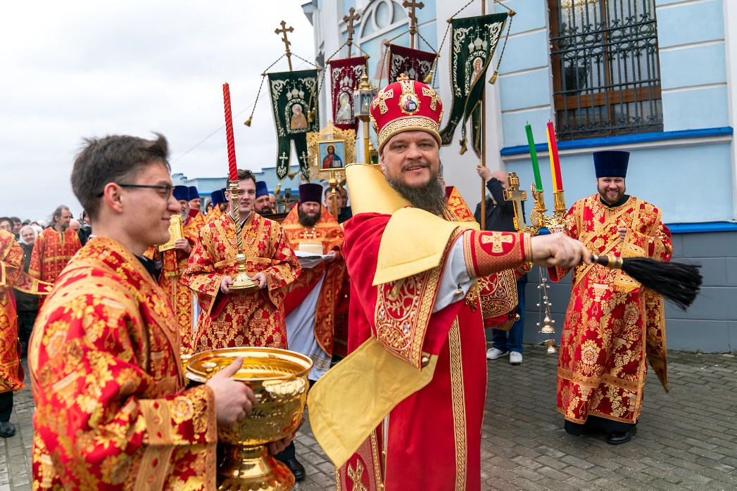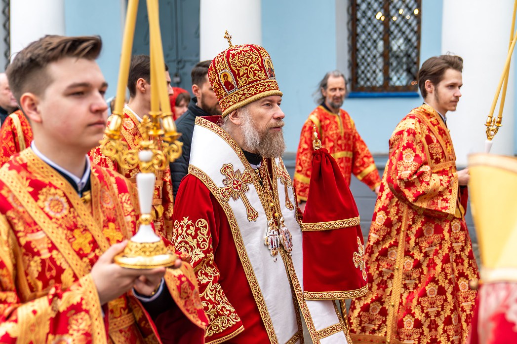 После заамвонной молитвы был совершен пасхальный крестный ход, символизирующий шествие по всему миру свидетелей Воскресения Христа – апостолов и жен-мироносиц с проповедью о Христе Воскресшем. На четырех сторонах храма совершалось окропление верующих святой водой.