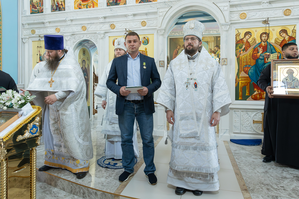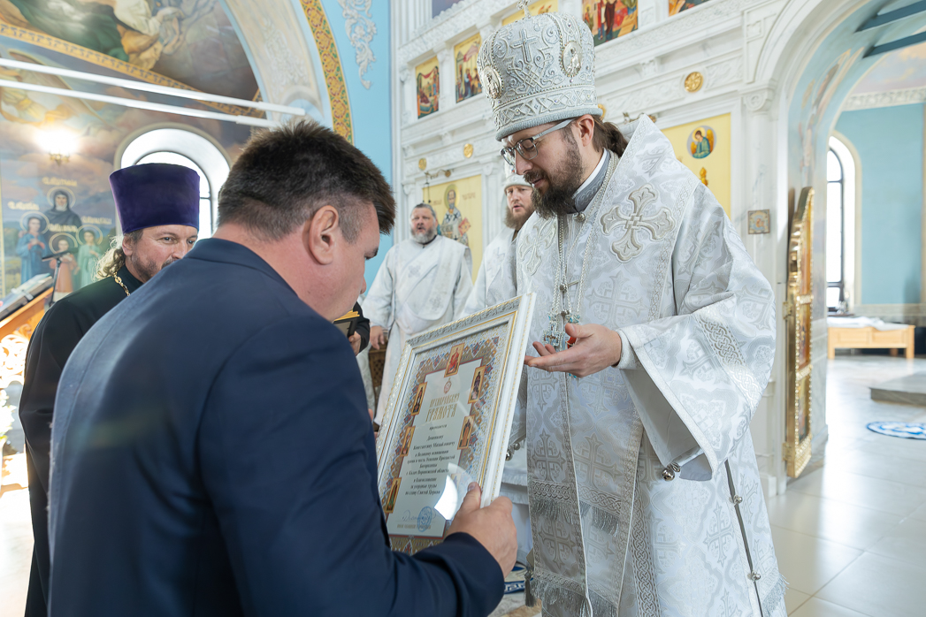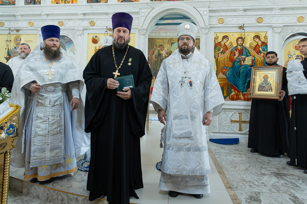 После Правящий Архиерей вручил настоятелю, строителям, благотворителям и благоукрасителям храма церковные награды. Во внимание к усердным трудам Святославу Вячеславовичу Абрычкину и настоятелю храма Успения Пресвятой Богородицы города Калач иерею Димитрию Ткаченко была вручена медаль святителя Митрофана I-го епископа Воронежского III степени; Константину Михайловичу Деменкову и матушке Иулиании Ткаченко – Архиерейская грамота; Анне Дмитриевне Жук, Анне Николаевне Жук, Татьяне Павловне Войтенко, Игорю Ивановичу Пацеву, Софии Петровне Зеленко, Галине Викторовне Бочкаревой, Марине Николаевне Литвиновой, Галине Ивановне Гусаковой, Галине Николаевне Шевцовой и Евгению Николаевичу Косенко – благодарственные письма.