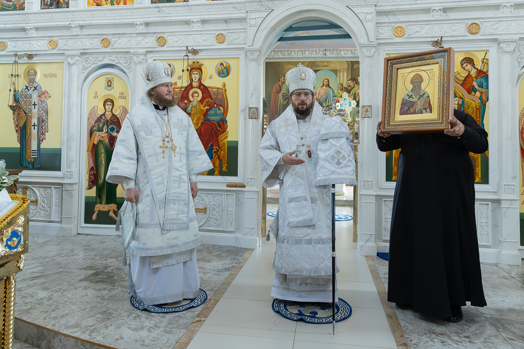 Затем епископ Дионисий преподнес в дар епископу Серафиму икону свт. Спиридона Тримифунтского и пожелал Его Преосвященству помощи Божией в служении Святой Церкви, телесного здравия и многих лет.