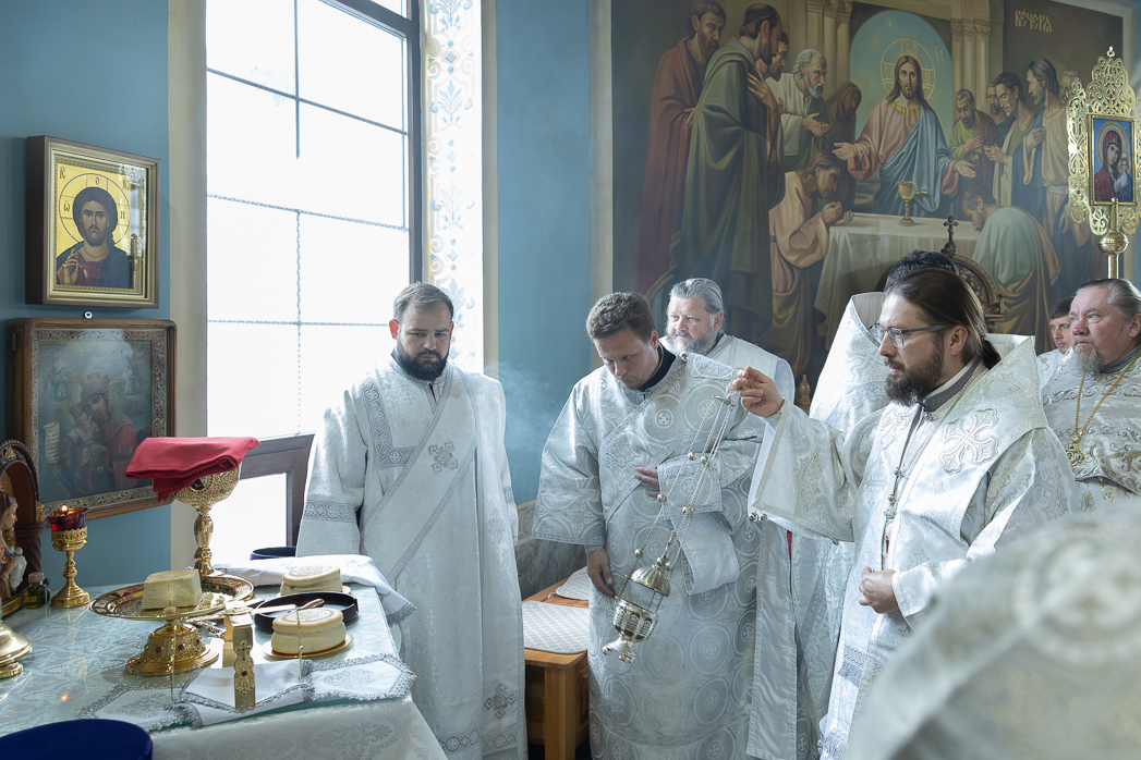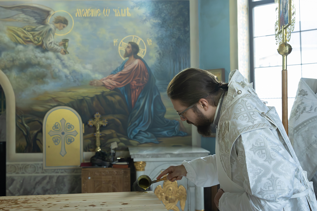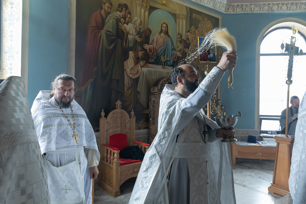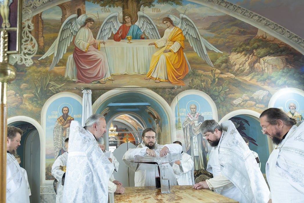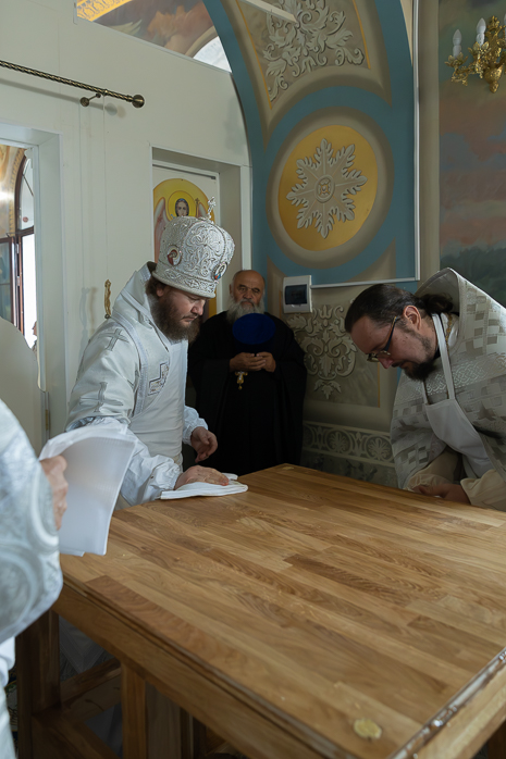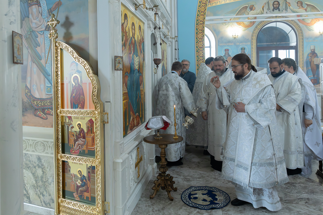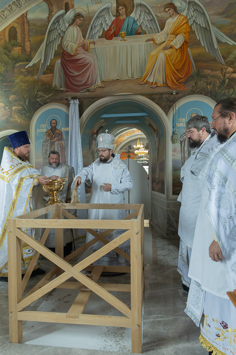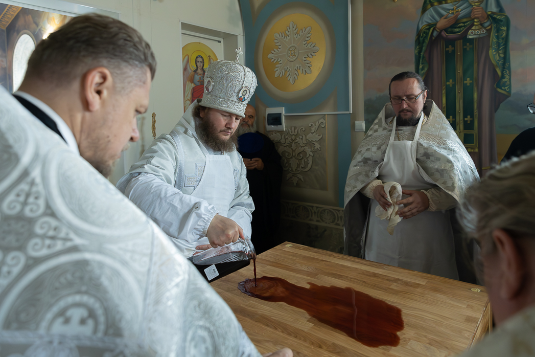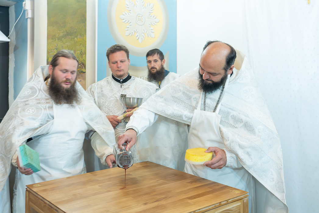 После облачения престолов и жертвенников в священные ризы епископ Дионисий совершил каждение Престолов, трех алтарей и всего храма; при этом епископ Серафим помазывал Святым Миром крестообразно четыре стены храма, а игумен Илия (Ждамиров) окропил стены храма святой водой.