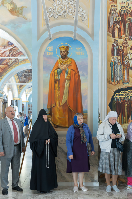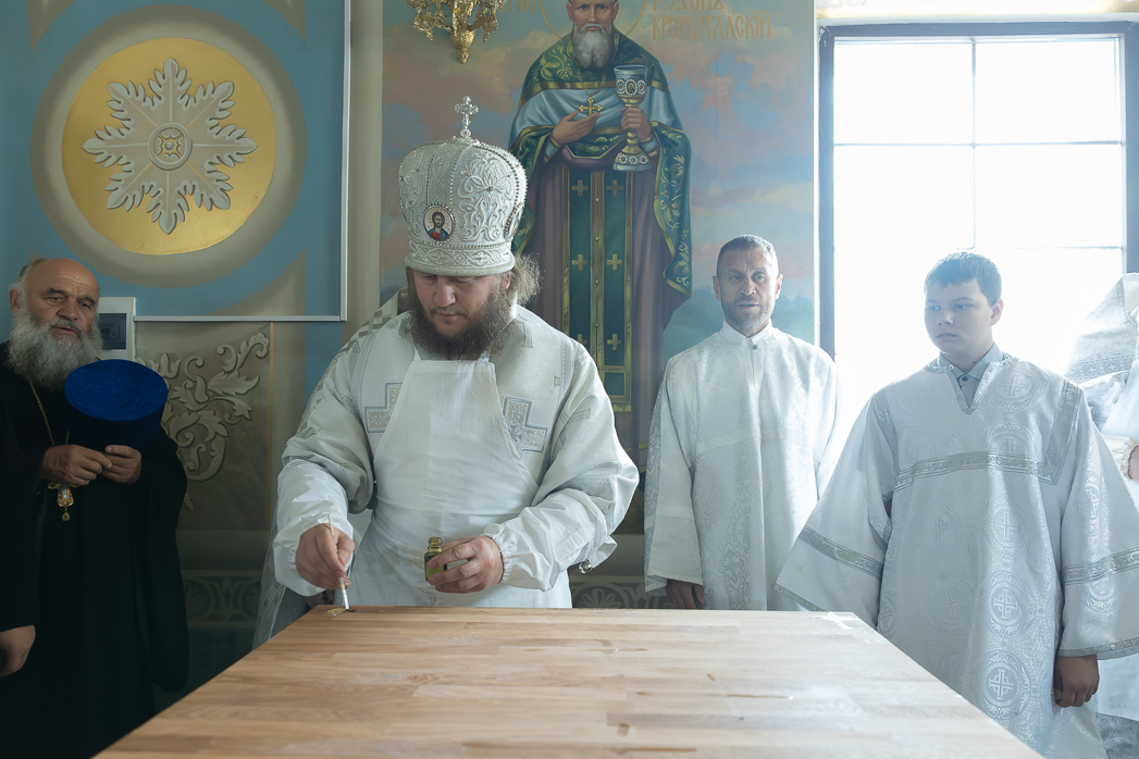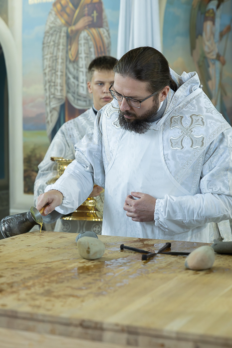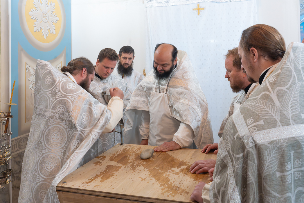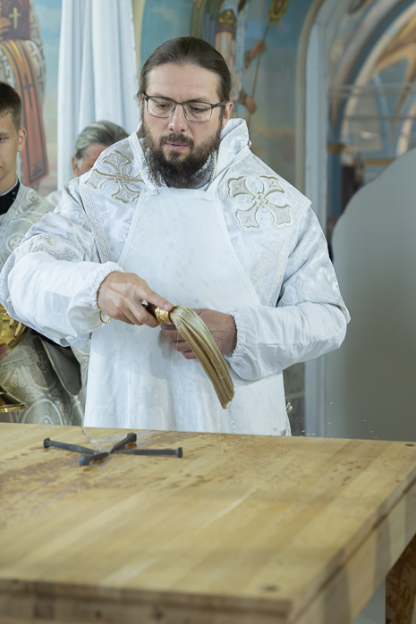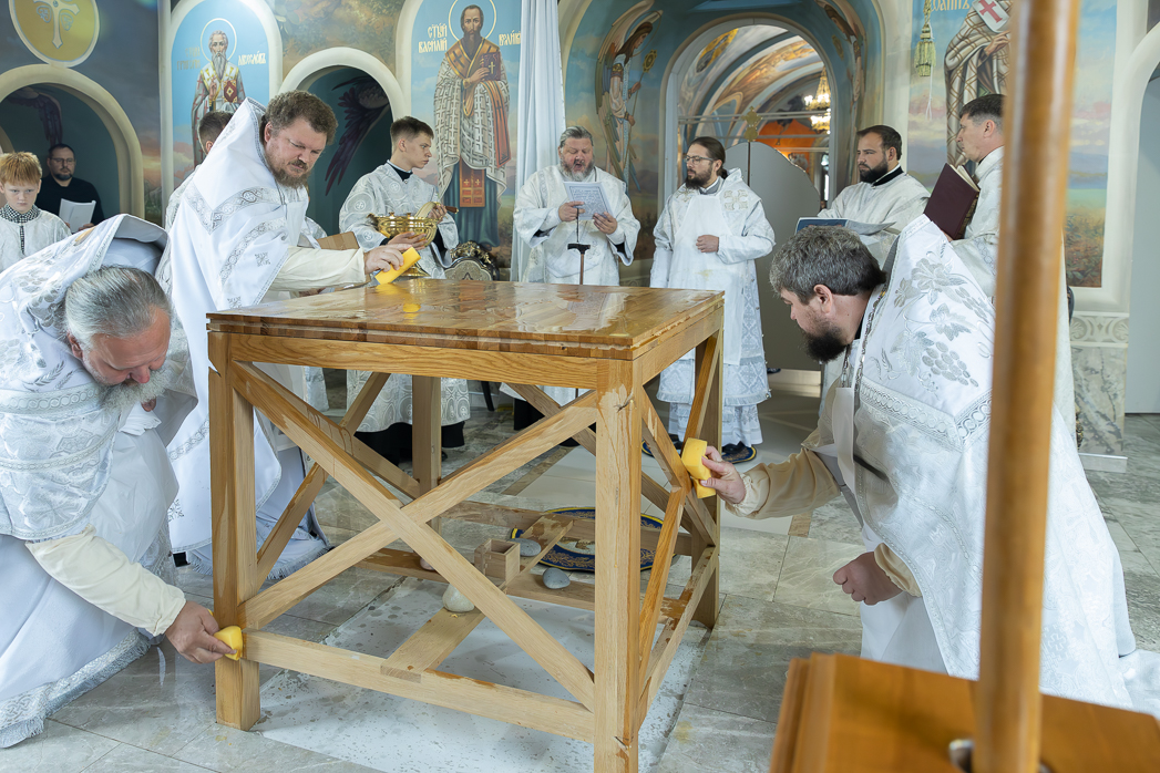 В начале чина Великого освящения Архипастыри и сослужащие клирики совершали священнодействия с главным предметом трех алтарей – Престолом. После утверждения на столпах престольной доски, прибиваемой четырьмя кованными гвоздями (по числу гвоздей при распятии Господа Иисуса Христа на Кресте), Владыка Дионисий и Владыка Серафим помазали новосооруженные Престолы Святым Миром. Затем были окроплены святой водой и одеты священные облачения на престолы и жертвенники. Священнодействия чередовались чтением псалмов и особых молитв, возносимых Архиереями о новосооруженном храме и о всех в нем служащих и молящихся.