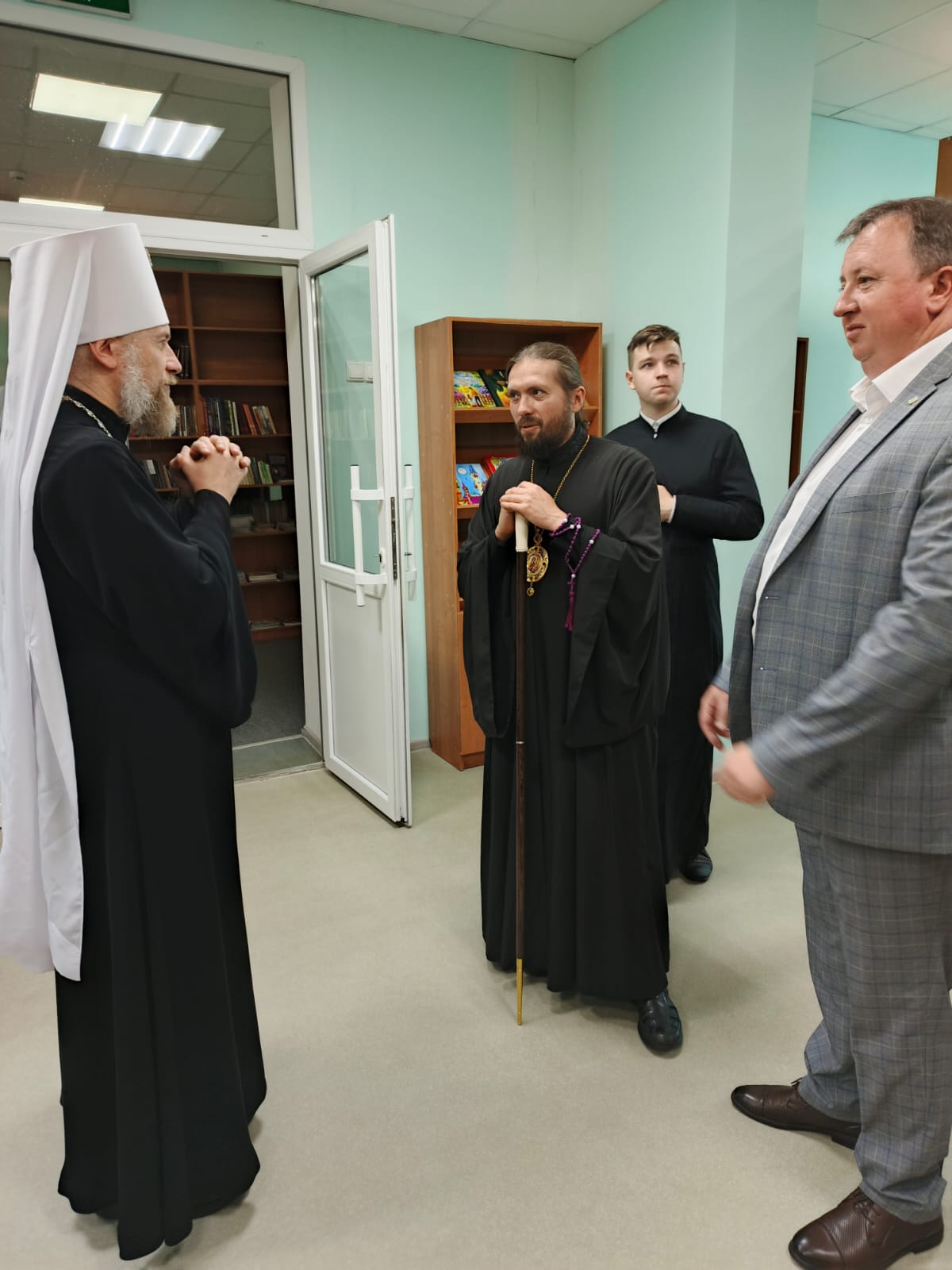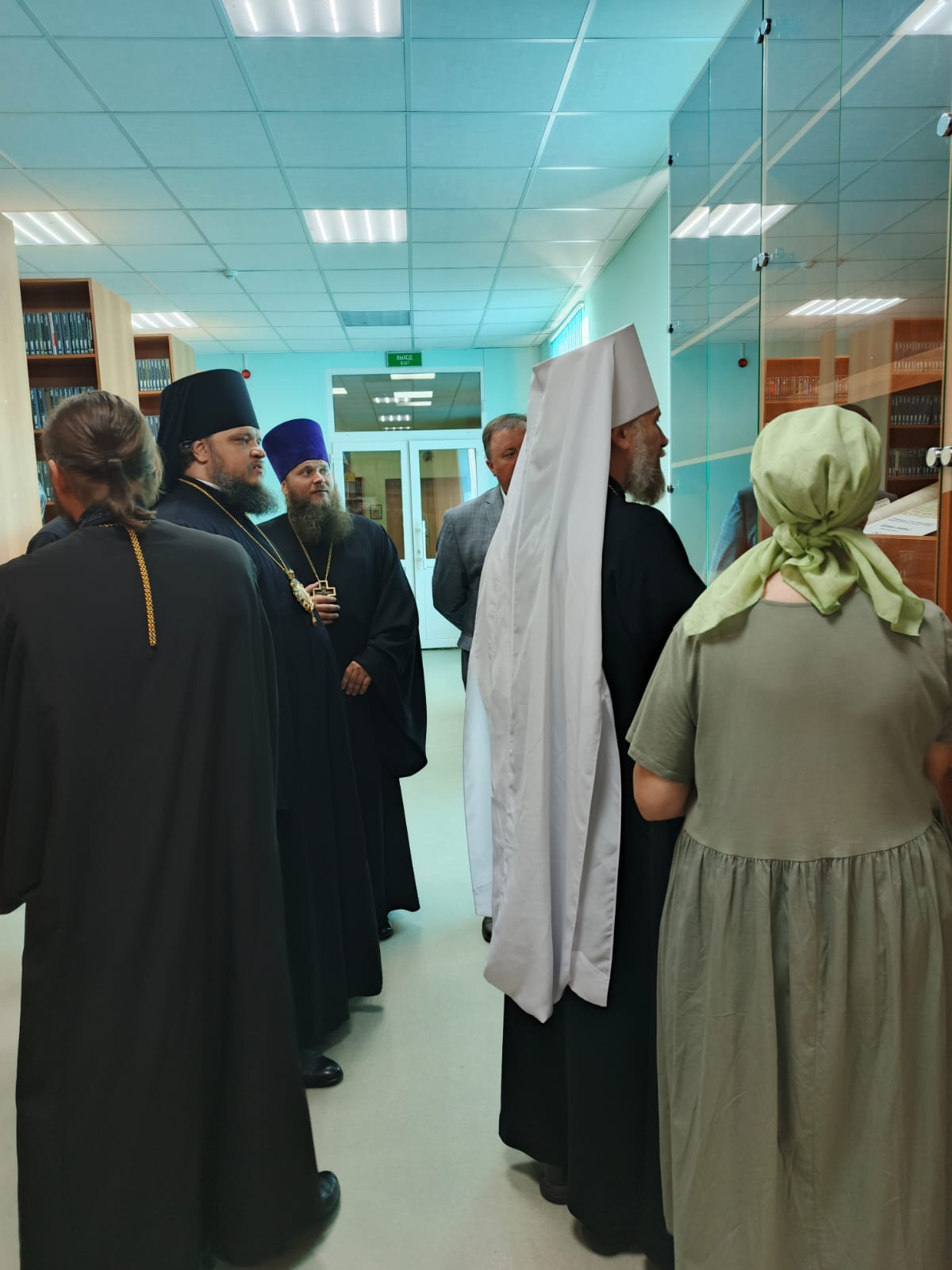 Далее Архипастыри посетили библиотеку при Свято-Ильинском кафедральном соборе, где ознакомились с экспонатами библиотеки и старинными книгами, переданными в дар ктитором храмового комплекса Ольшанским Николаем Михайловичем.