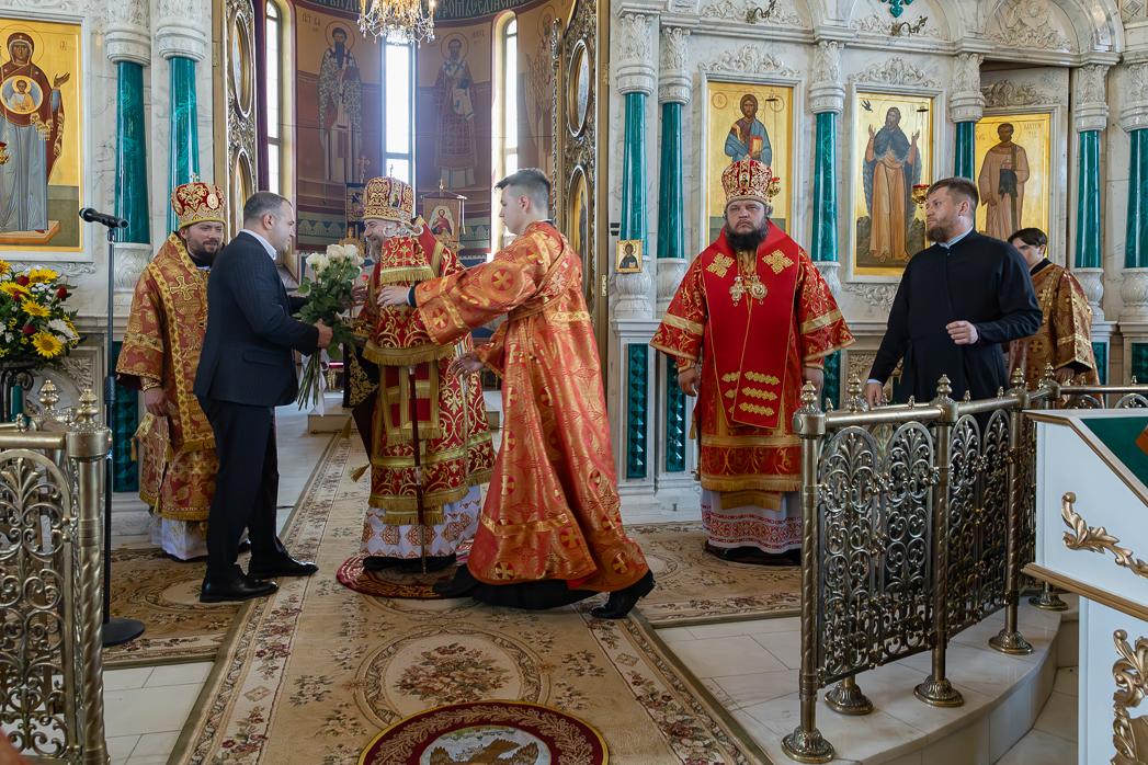 С ответным словом к духовенству обратился глава администрации Россошанского муниципального района Береснев Роман Николаевич. Глава поблагодарил митрополита Леонтия, епископа Дионисия и епископа Сергия за радость молитвенного общения в этот праздничный день, поздравил всех присутствующих с престольным праздником и вместе с главой администрации городского поселения город Россошь Кисель Максимом Сергеевичем преподнесли Владыке Леонтию букеты роз.