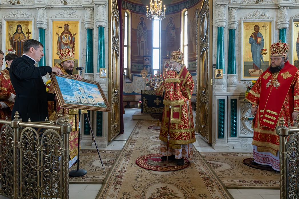 Затем епископ Дионисий преподнес в дар митрополиту Леонтию картину с изображением Свято-Ильинского кафедрального собора города Россошь и пожелал Его Высокопреосвященству помощи Божией в служении Святой Церкви, телесного здравия и многих лет.