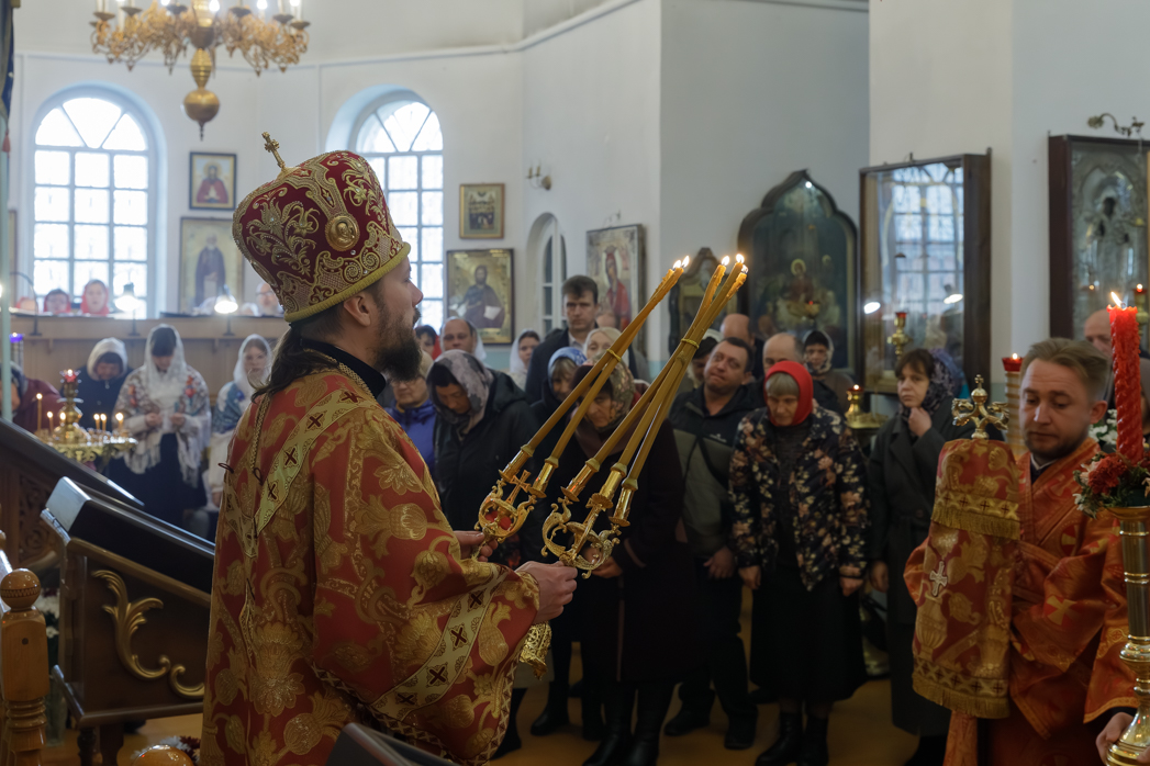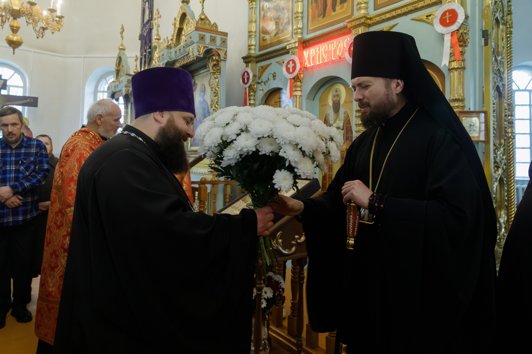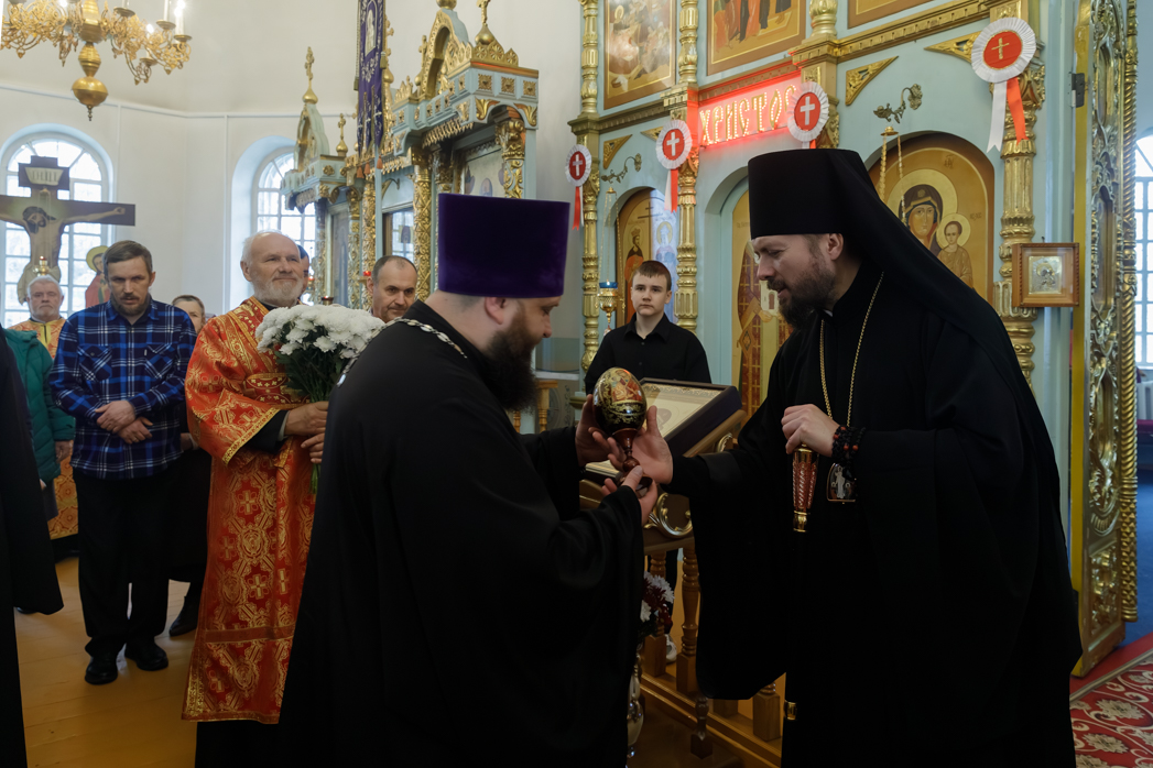 После с приветственным словом к Преосвященнейшему Владыке обратился благочинный Каменского церковного округа иерей Сергий Папин. Священнослужитель поблагодарил Архипастыря за духовную радость совместного молитвенного общения в эти святые дни и преподнес Ему в дар пасхальное яйцо и букет цветов.
