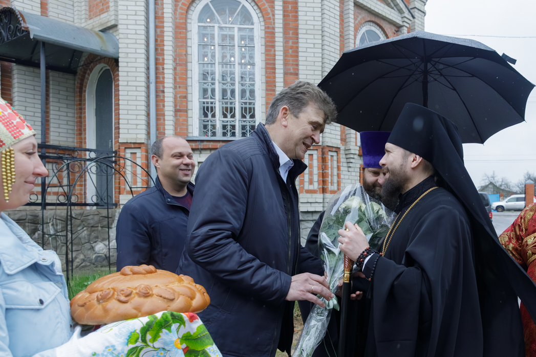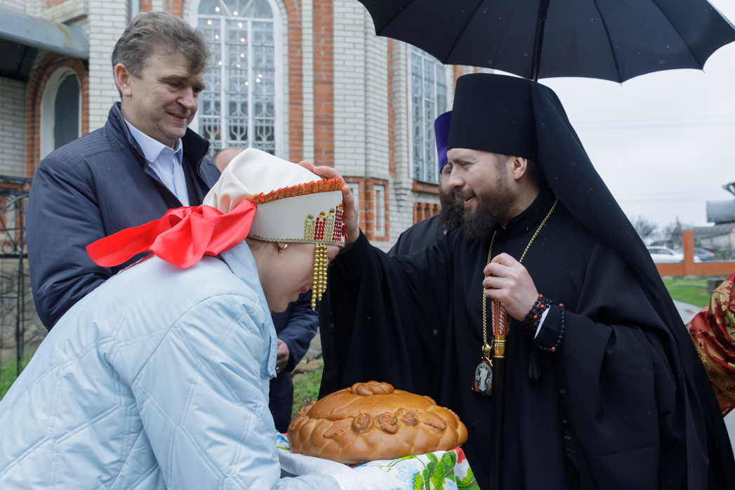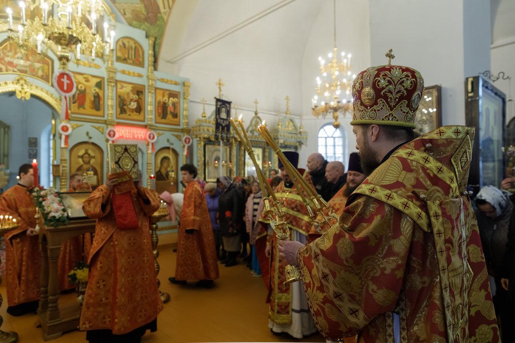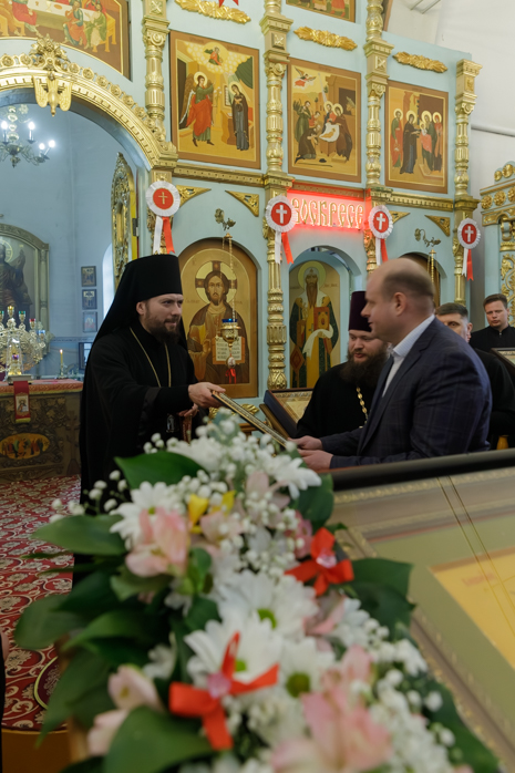 У храма Правящего Архиерея встречали: благочинный Каменского церковного округа иерей Сергий Папин; заместитель главы администрации Каменского муниципального района Юрий Петрович Мошуров; глава Каменского городского поселения Евгений Александрович Лущиков и прихожане храма.