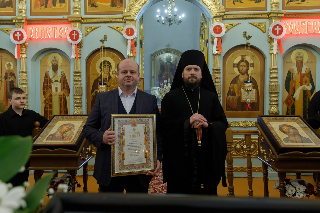 Затем во внимание к усердным трудам на благо Святой Церкви епископ Россошанский и Острогожский Дионисий удостоил Евгения Евгеньевича Рогозина Архиерейской грамоты.