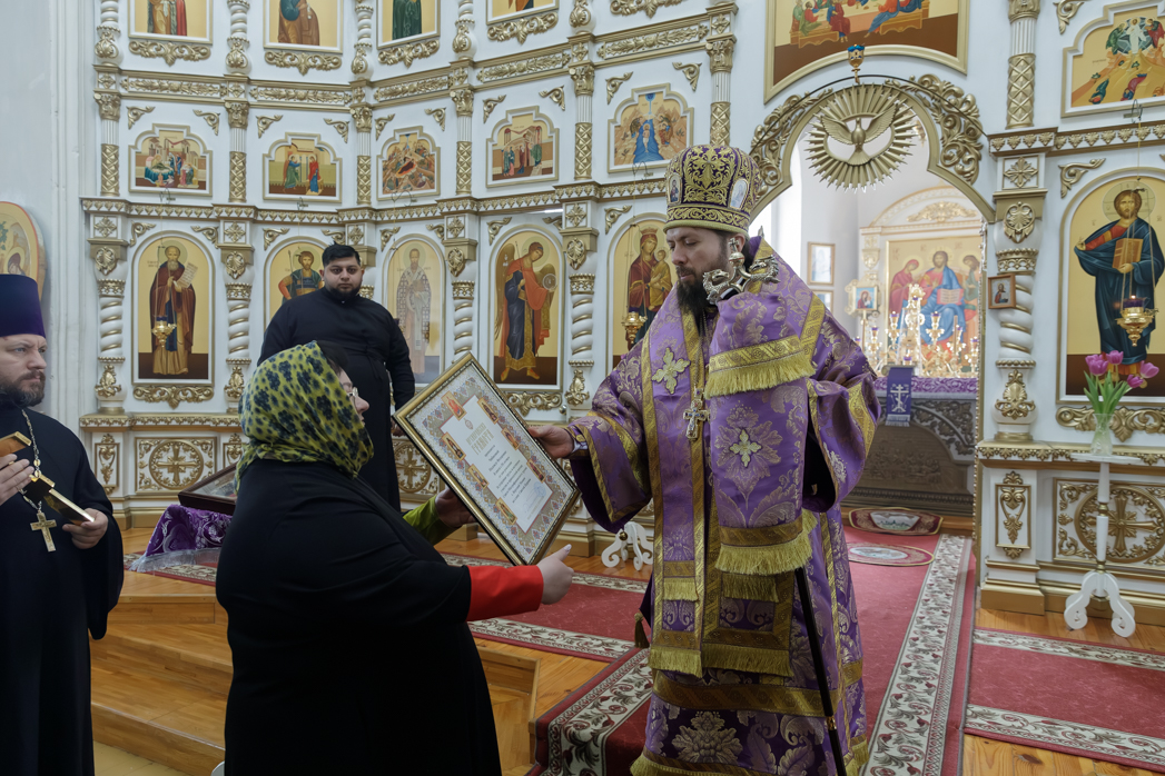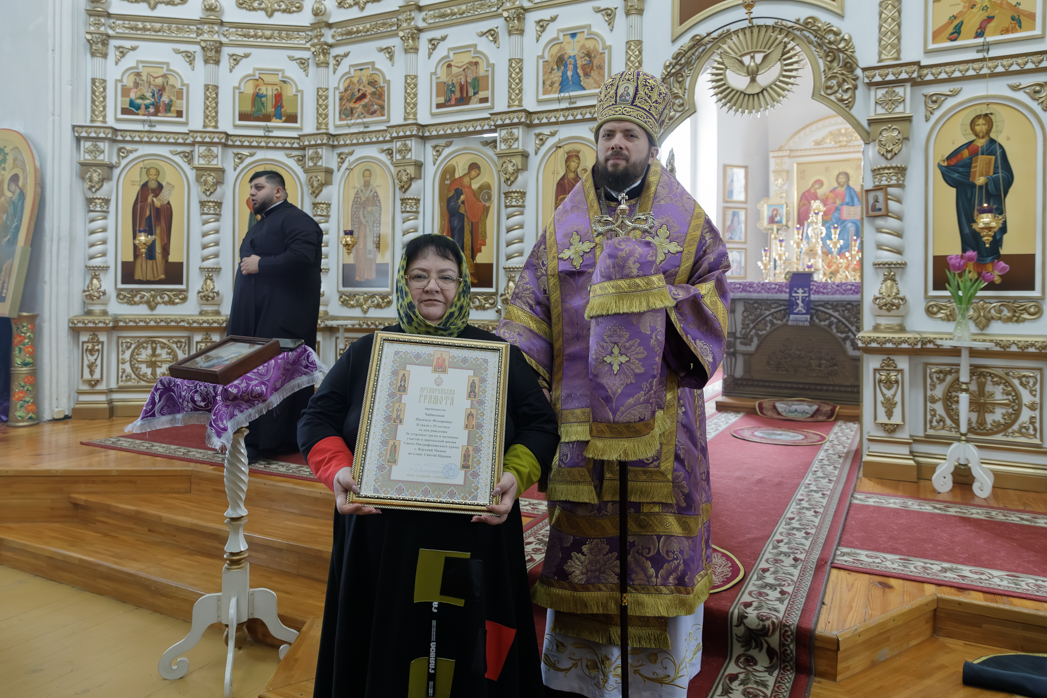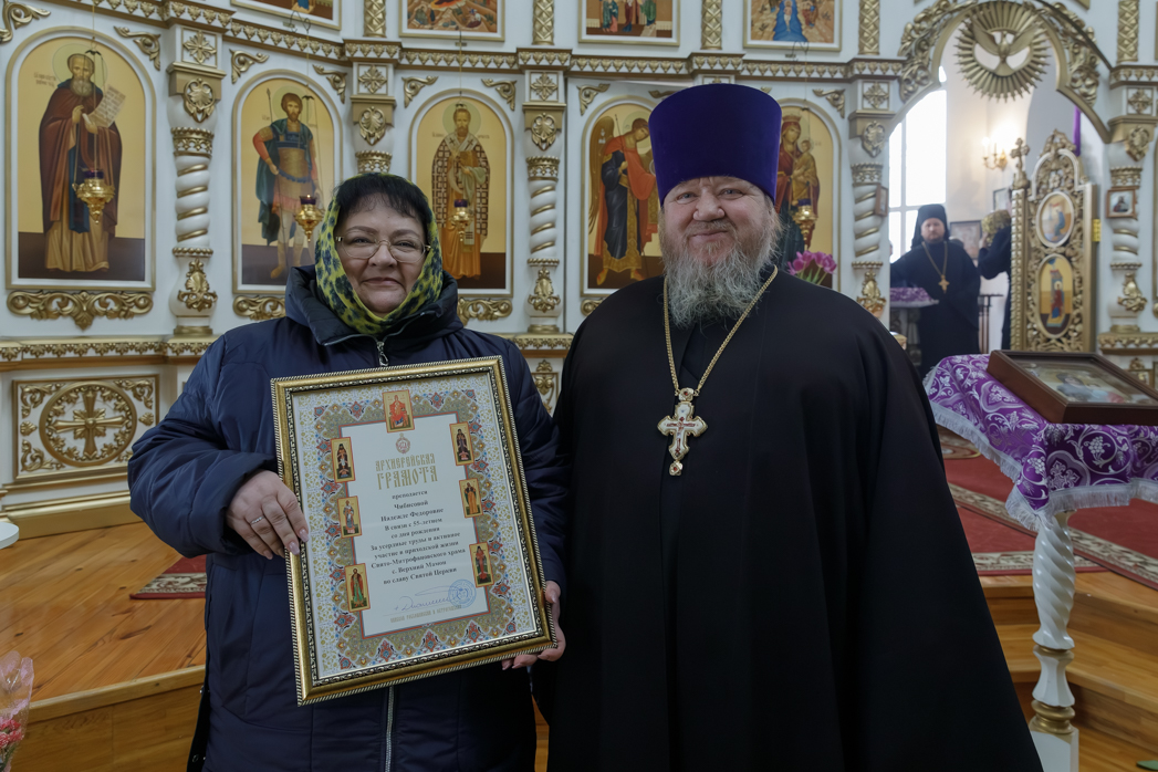 По завершении проповеди в связи с отмечаемой юбилейной датой со дня рождения и во внимание к усердным трудам, активное участие в приходской жизни Свято-Митрофановского храма села Верхний Мамон и во славу Святой Церкви Правящий Архиерей удостоил матушку Надежду Чибисову Архиерейской грамоты.