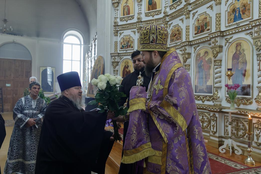 Затем с приветствием к Архипастырю обратился настоятель храма протоиерей Сергий Чибисов. В знак сыновней любви священнослужитель преподнес в дар Владыке букет цветов.