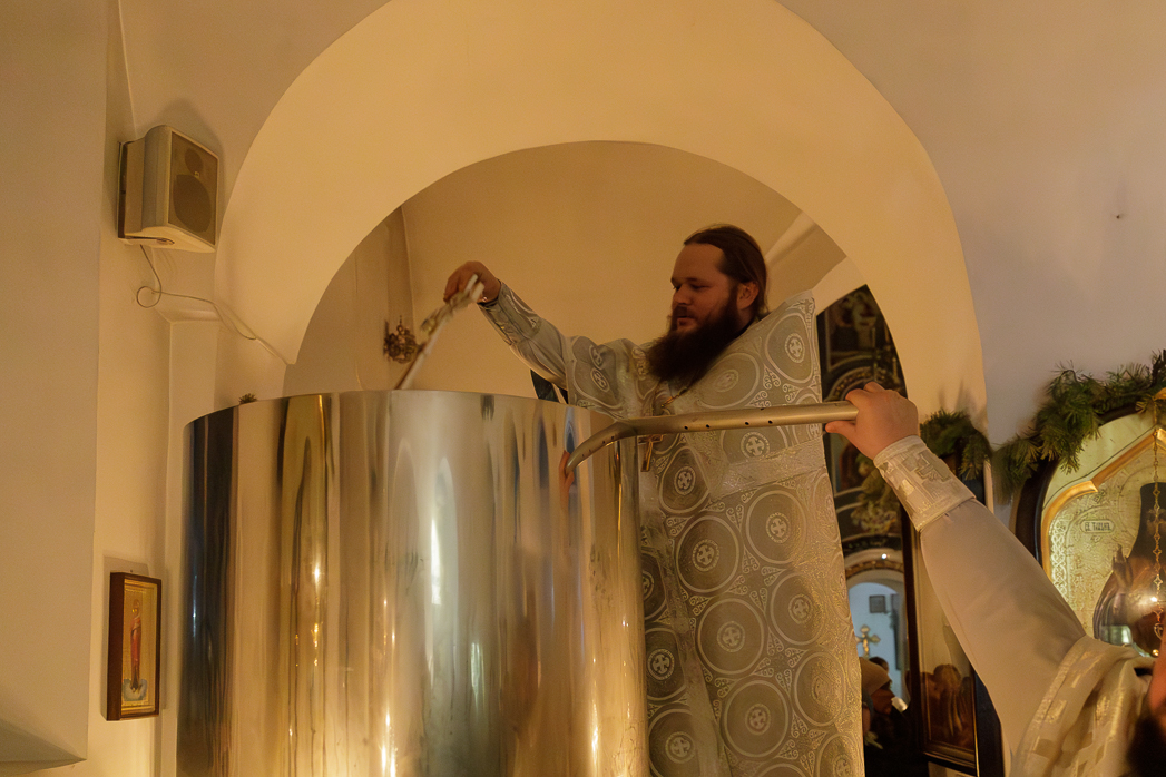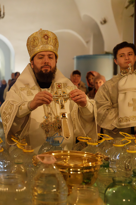 После заамвонной молитвы епископ Дионисий вместе с сослужащим духовенством совершил чин Великого водоосвящения. При торжественном пении хором стихир, раскрывающих духовный смысл праздника, Архипастырь изнес на середину храма напрестольный крест и совершил каждение водосвятных чаш и вместительных баков, наполненных водой, приготовленной для большого числа верующих.