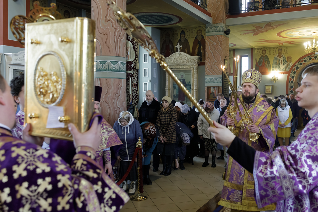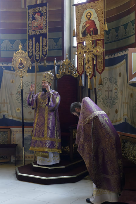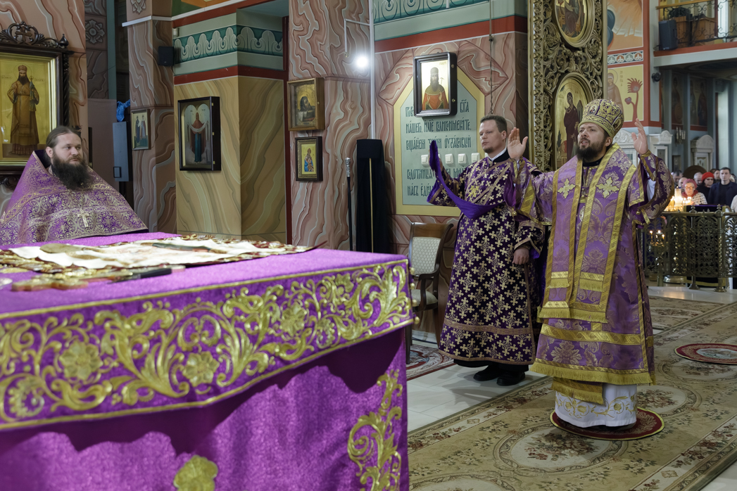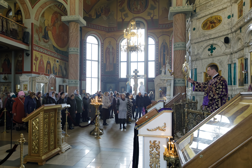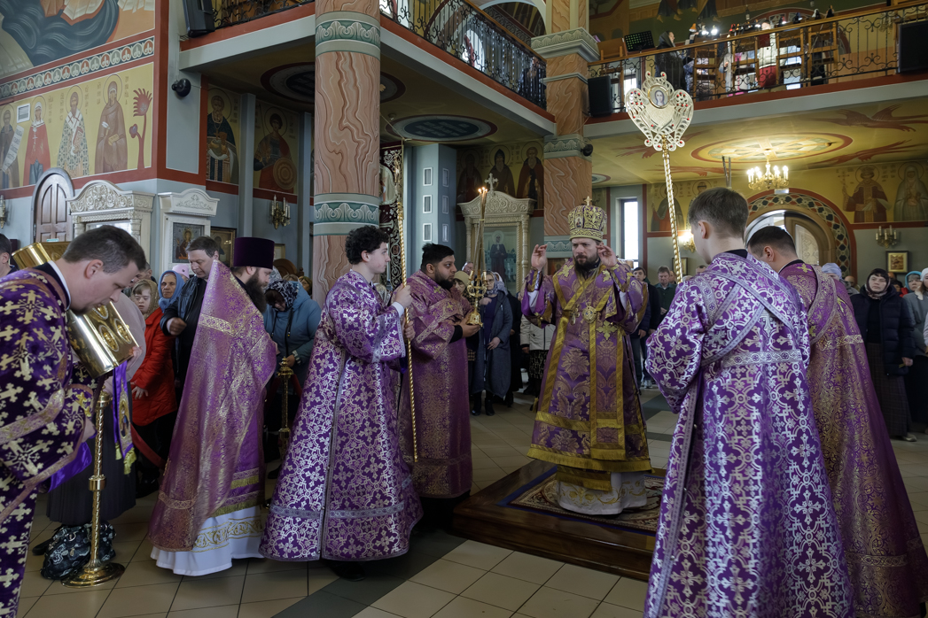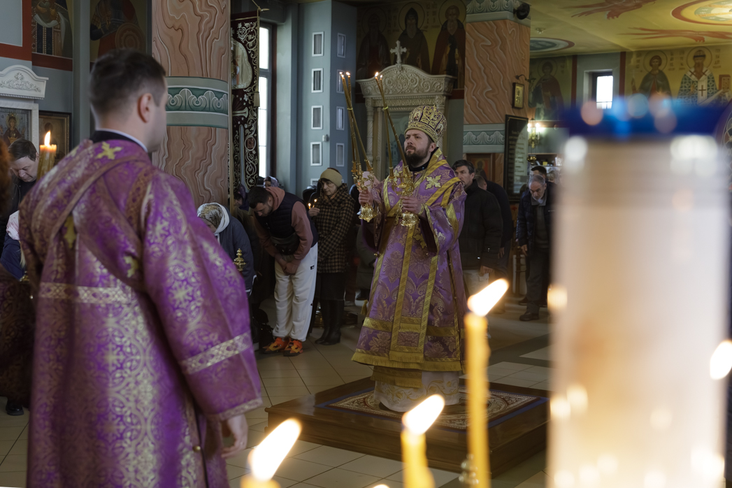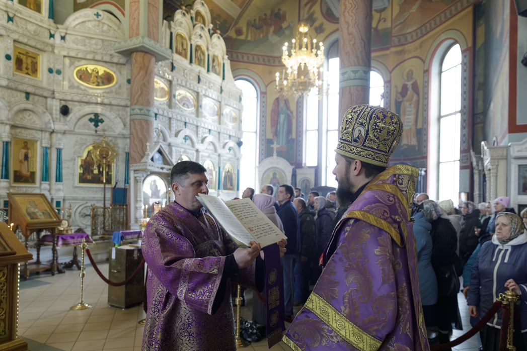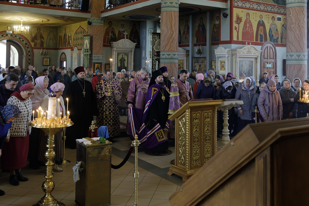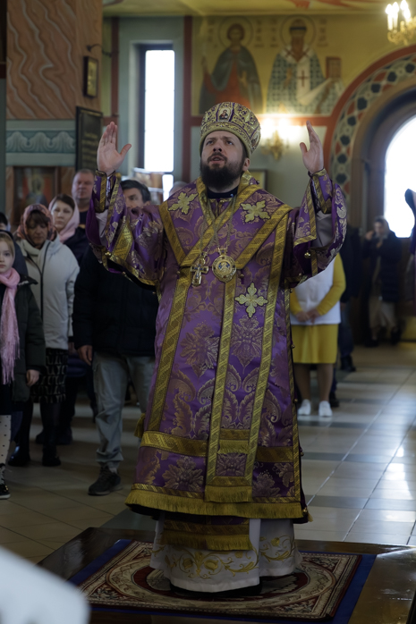 На сугубой ектении были произнесены прошения: «...о еже прияти молитвы нас, недостойных рабов Твоих, в сию годину испытания...» и прошение о «Преосвященных архипастырях, пастырях, монашествующих и мирянах земли Украинския, о единстве Церкви Христовы ревнующих, в заточении и гонениях сущих». Затем епископ Дионисий вознес молитву о Святой Руси. По благословению Святейшего Патриарха Московского и всея Руси Кирилла эта молитва читается во всех храмах Русской Православной Церкви.