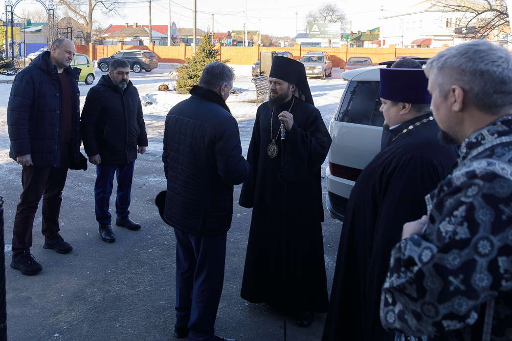 У храма Правящего Архиерея встречали: благочинный Калачеевского церковного округа иерей Иоанн Суздальцев, глава администрации Калачеевского муниципального района Николай Тимофеевич Котолевский, глава администрации городского поселения города Калач Дмитрий Николаевич Дудецкий и заместитель главы администрации – руководитель отдела по образованию администрации Калачеевского муниципального района Александр Вячеславович Пономарев.