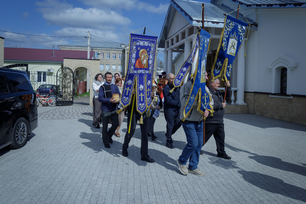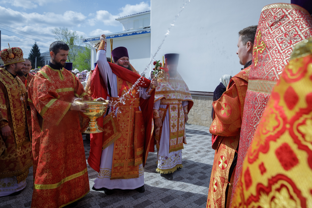 По прочтении заамвонной молитвы был совершен Пасхальный крестный ход, символизирующий шествие по всему миру свидетелей Воскресения Христа – апостолов и жен-мироносиц с проповедью Пасхальной евангельской вести. У алтаря храма Архипастырь возгласил евангельское зачало о Воскресении Христовом. На четырех сторонах храма совершалось окропление верующих святой водой. На многократное приветствие Владыки и священнослужителей: «Христос Воскресе!» – десятки богомольцев воодушевленно отвечали: «Воистину Воскресе!».
