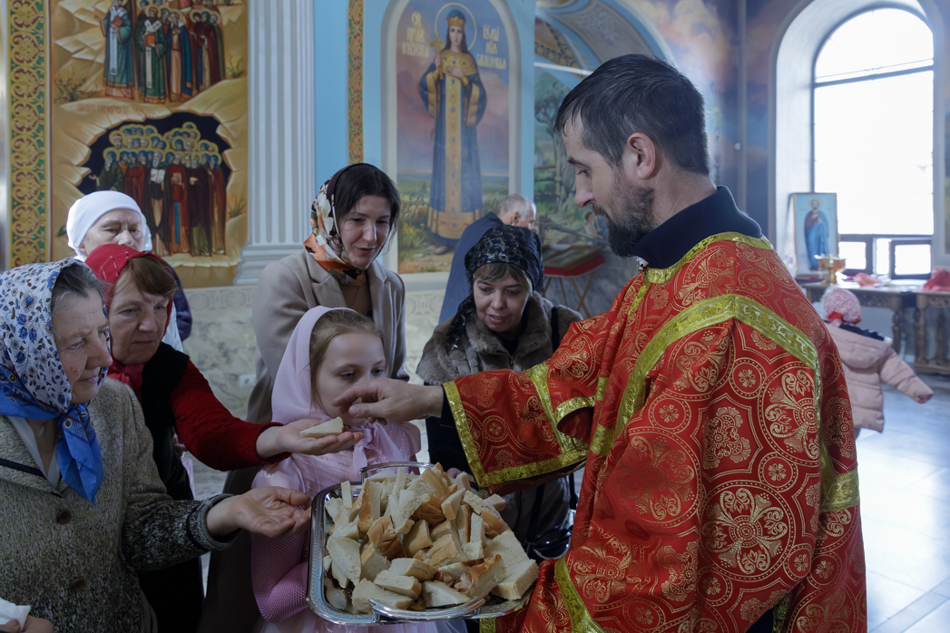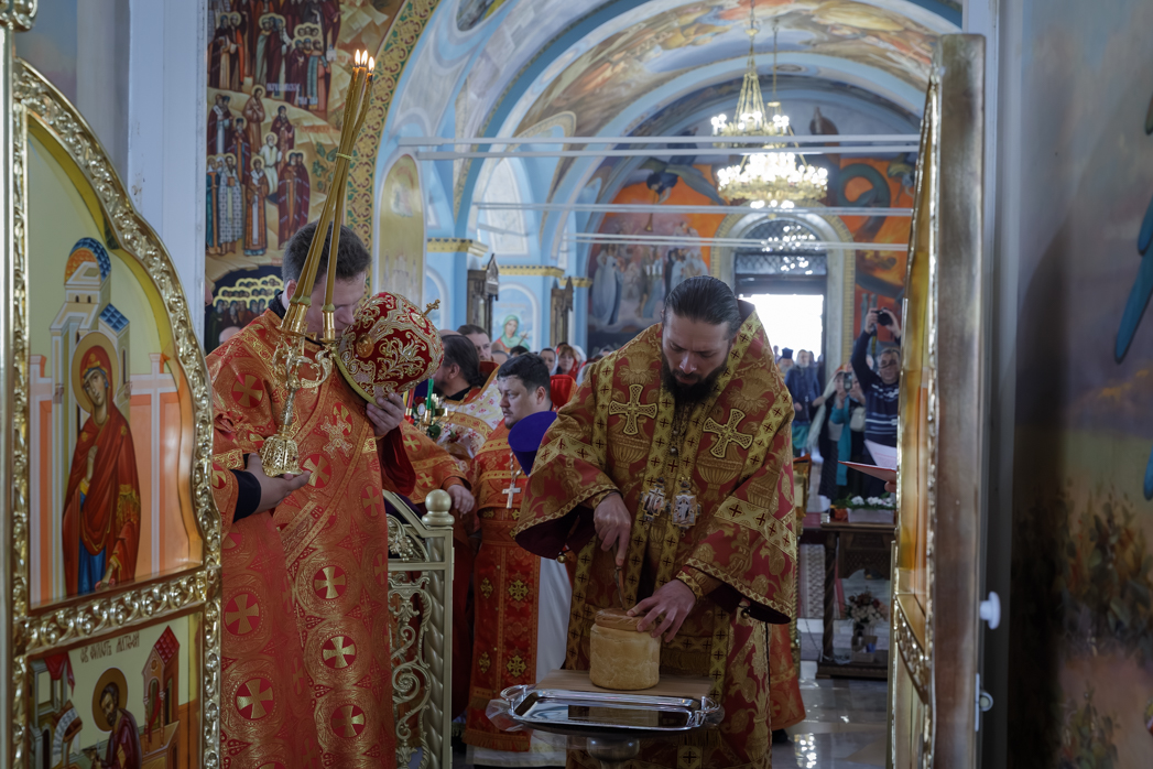 По возвращении в храм Владыка вознес молитву на раздробление артоса, после чего освященные хлебы были разрезаны и розданы верующим.