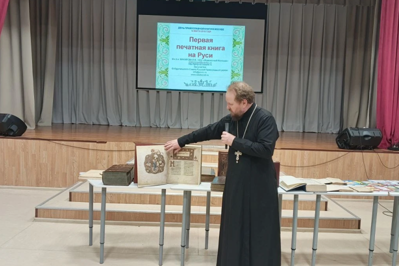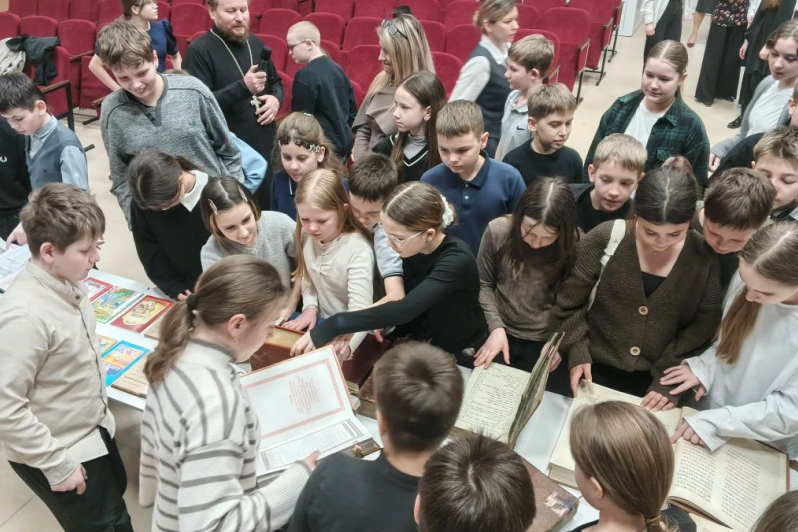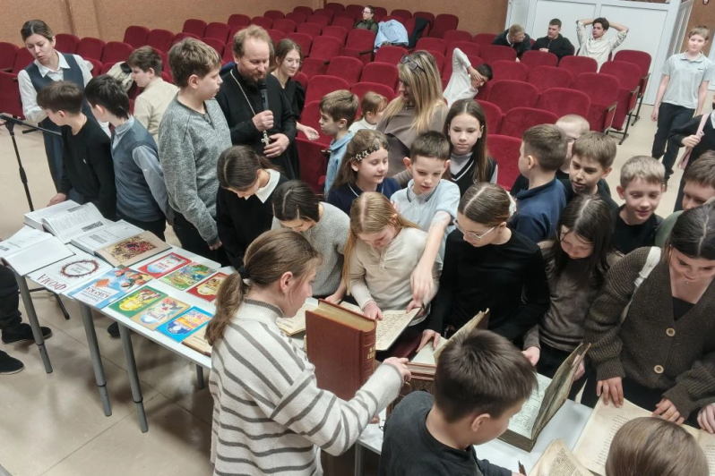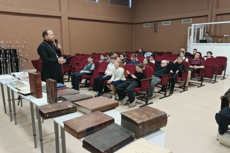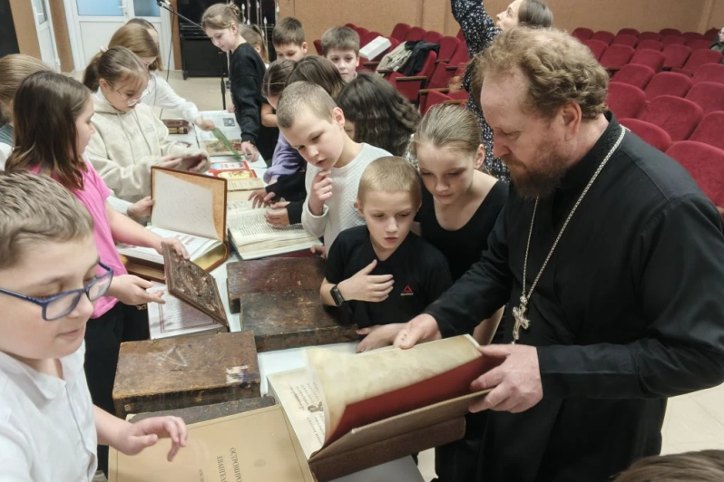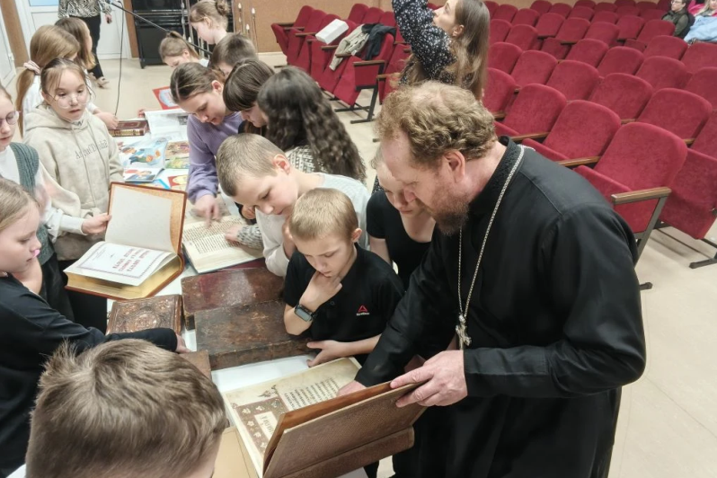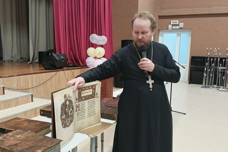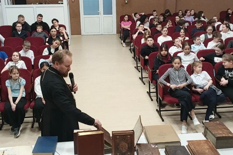 Затем благочинный рассказал детям о старинных православных книгах XVII, XVIII, XIX веков, выставка которых была представлена в актовом зале. А также о значении книги и ее влиянии на духовно-нравственное и интеллектуальное развитие человека и призвал ребят обязательно стремиться к чтению книг.