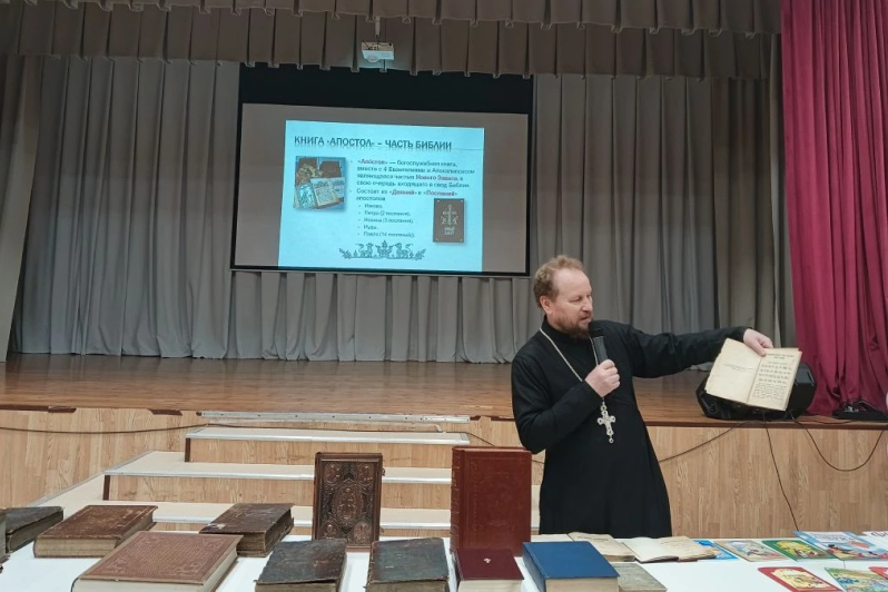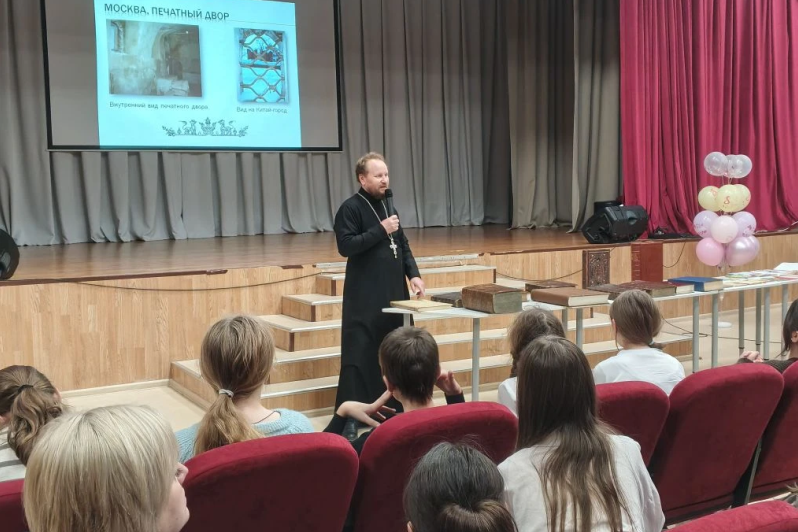 Также он отметил, что православные книги учат добру, милосердию, состраданию, воспитывают любовь к ближним и помогают увидеть мир во всем его удивительном разнообразии. Целью лекции благочинный ставил формирование у учащихся представления об основных вехах истории древнерусской книжности и ознакомление учащихся с памятниками древнерусской литературы посредством презентационного материала.