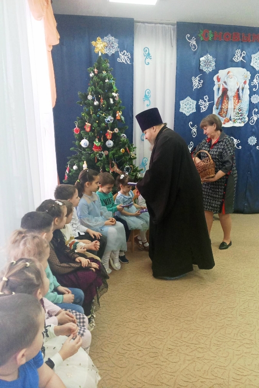 По завершении выступления протоиерей Сергий обратился к детям со словами поздравления с праздником Рождества Христова и подарил каждому ребенку сладкий подарок.