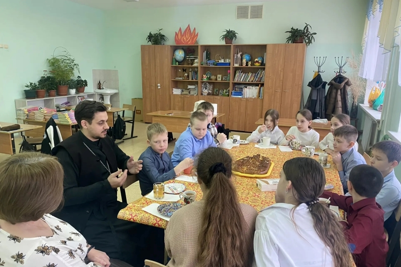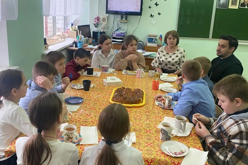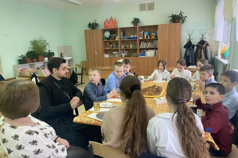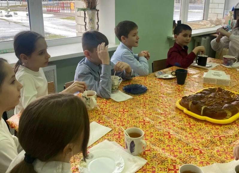 Школьники вместе с классным руководителем Натальей Юрьевной Кодатской встретили батюшку по доброй масленичной традиции — с горячим чаем и домашней выпечкой. Этот жест создал по-настоящему тёплую и дружескую атмосферу, стал наглядным примером христианского гостеприимства и заботы о ближнем.